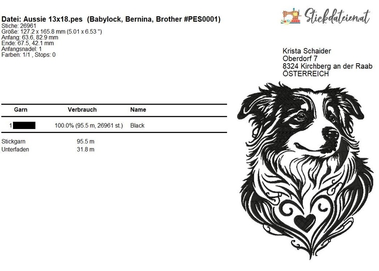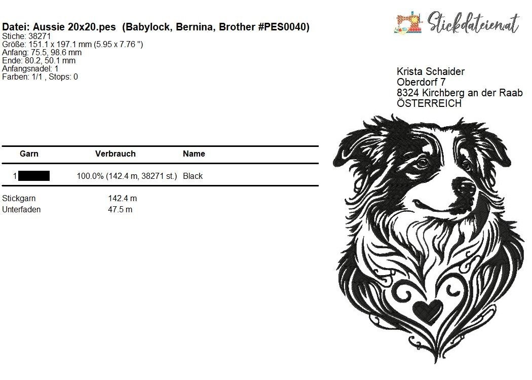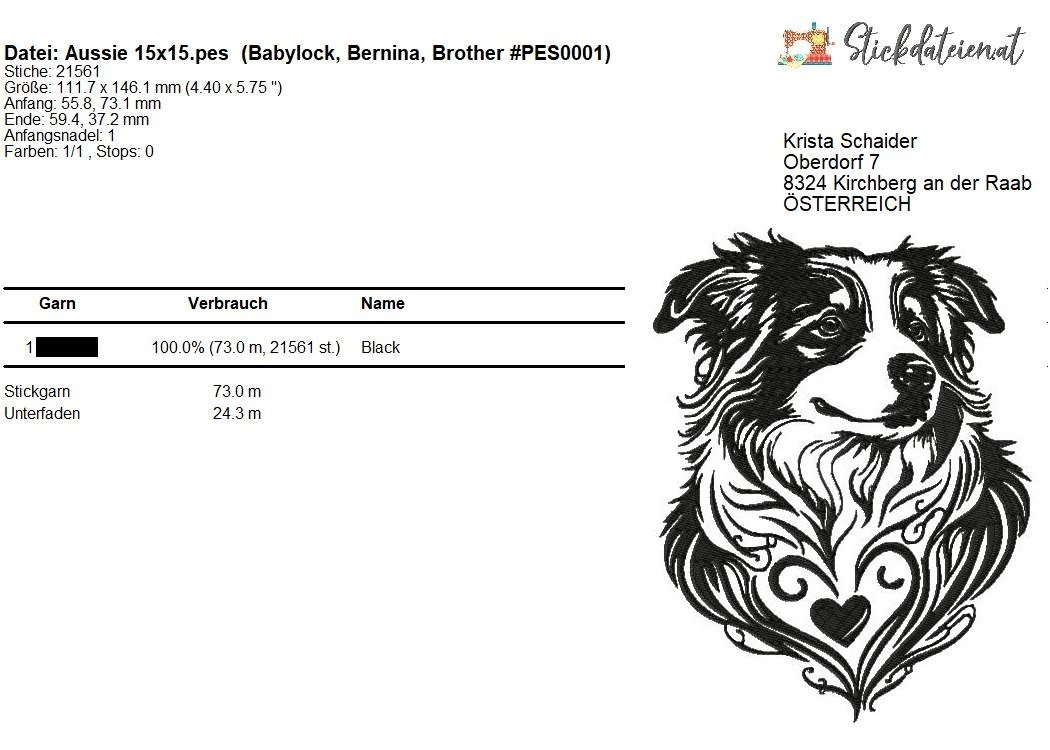 Bringen Sie mit dieser digitalen Stickdatei die lebendige Welt des Australian Shepherds in Ihre Handarbeitsprojekte und lassen Sie Ihre Kreationen im Glanz dieser wundervollen Rasse erstrahlen!