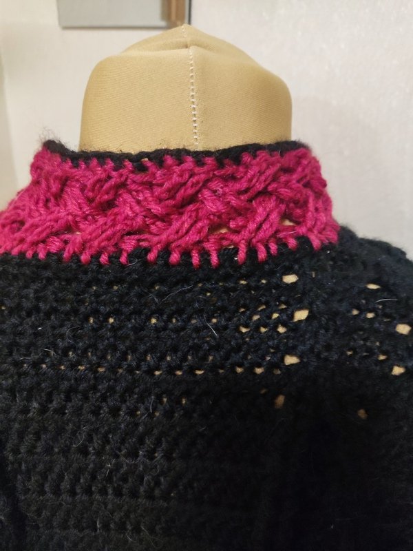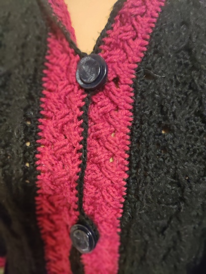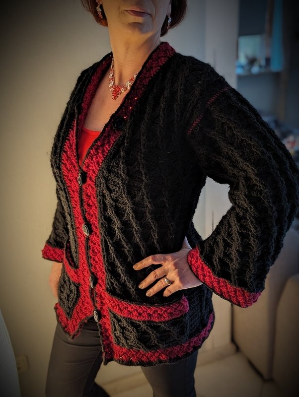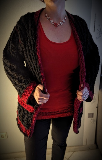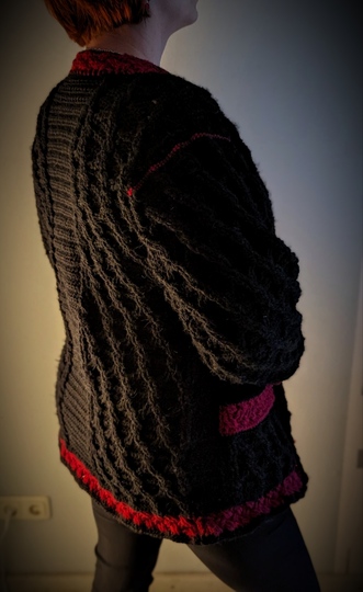 Größe L: ca. 1500 g in Schwarz + ca. 200 g Rot – empfohlene Nadelstärke 4,5 - 5 (ich habe mit 4,5 gearbeitet)