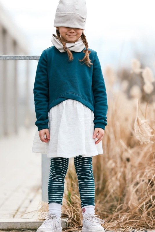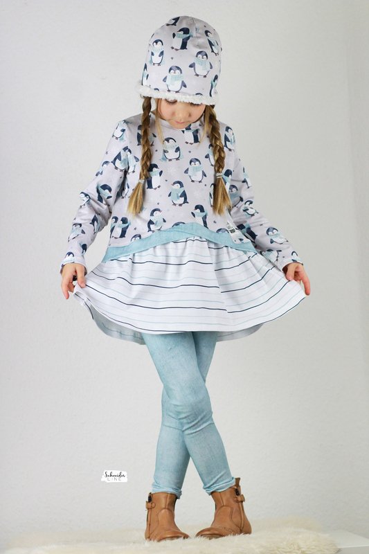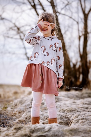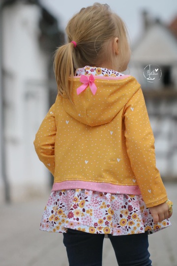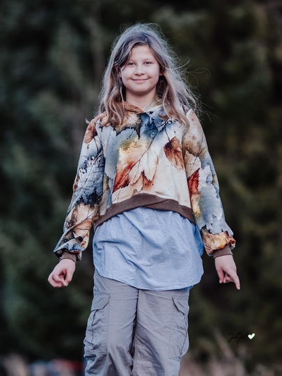 Der Halsausschnitt wird mit Bündchen oder Kapuze genäht. Bei den Ärmeln kannst Du zwischen normalen Ärmeln mit Bündchen, gesäumt oder Bischofs-Ärmeln wählen.