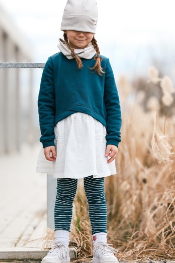Im Brust- und Ärmelbereich ist der Layer Sweater locker geschnitten und trägt sich dadurch besonders angenehm. In den kalten Monaten kann so prima ein Unterhemd oder ein Longsleeve drunter getragen werden. Der überlappende Kontraststreifen und die Rüsche verleihen dem Layer Sweater einen coolen Lagen Look. Hier kannst Du Haupt- sowie Kombistoffe toll miteinander kombinieren.