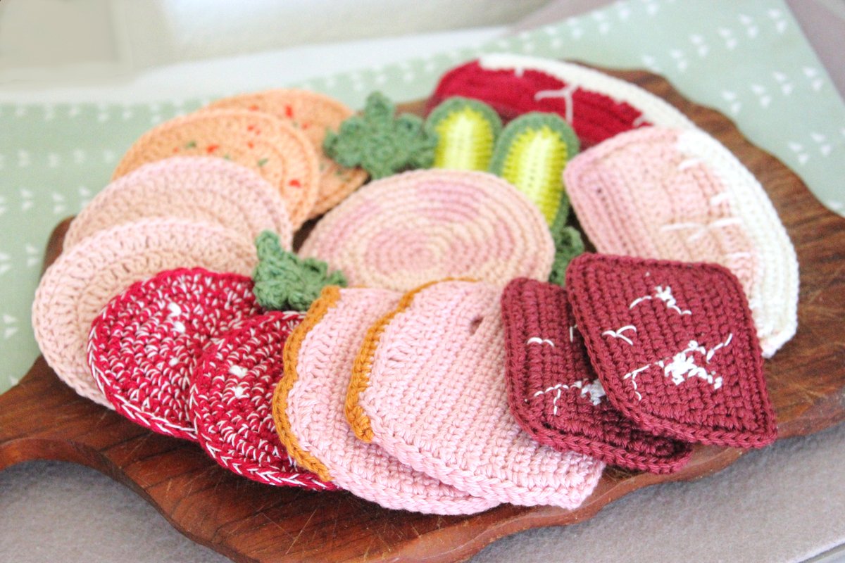 Mit dieser Anleitung bekommst du Schritt-für-Schritt-Anweisungen, um damit 7 verschiedene Wurstsorten (Lyoner, Paprikalyoner, Salami, Bierschinken, Fleischkäse, Schinken und Bündnerfleisch) zu häkeln, dazu noch längs halbierte Gewürzgurkenscheiben und etwas Petersilie.