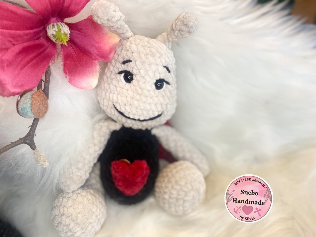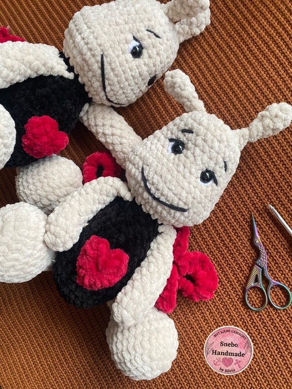 Du benötigst eine Häkelnadel mit 4 mm und dein Marienkäfer wird mit Chenillegarn in etwa 24 cm lang und 14 cm breit.