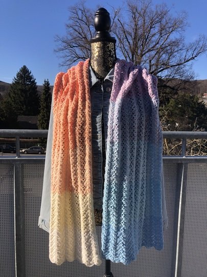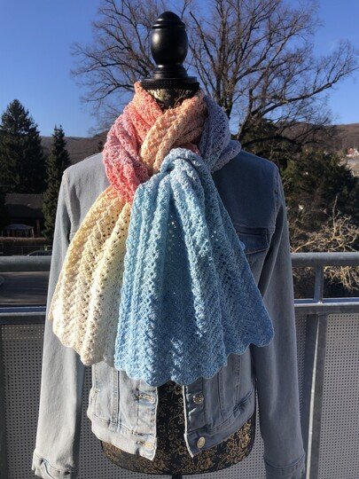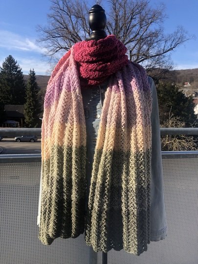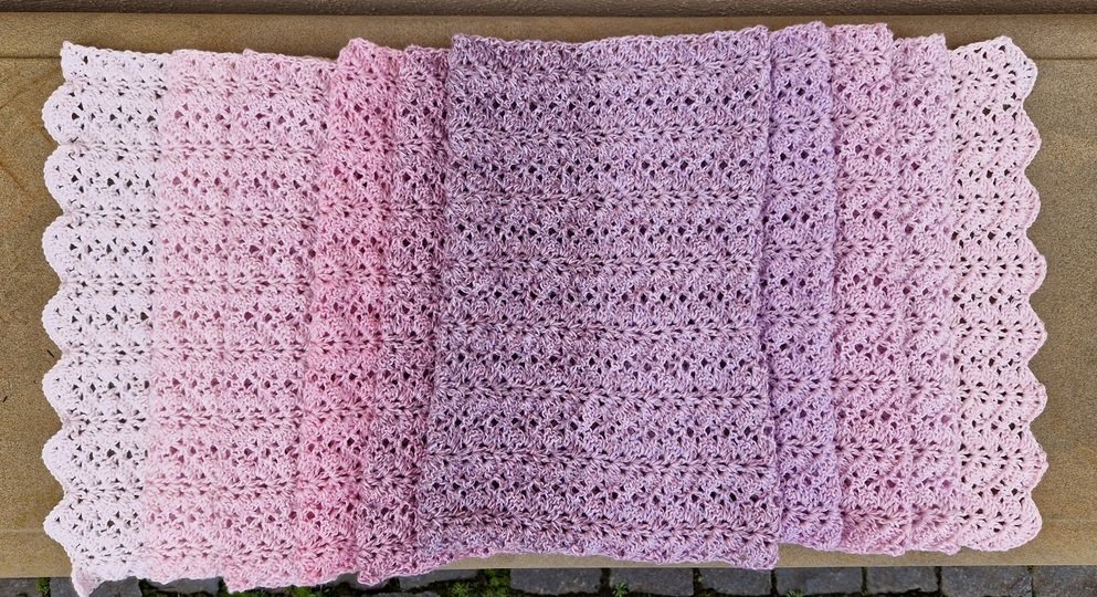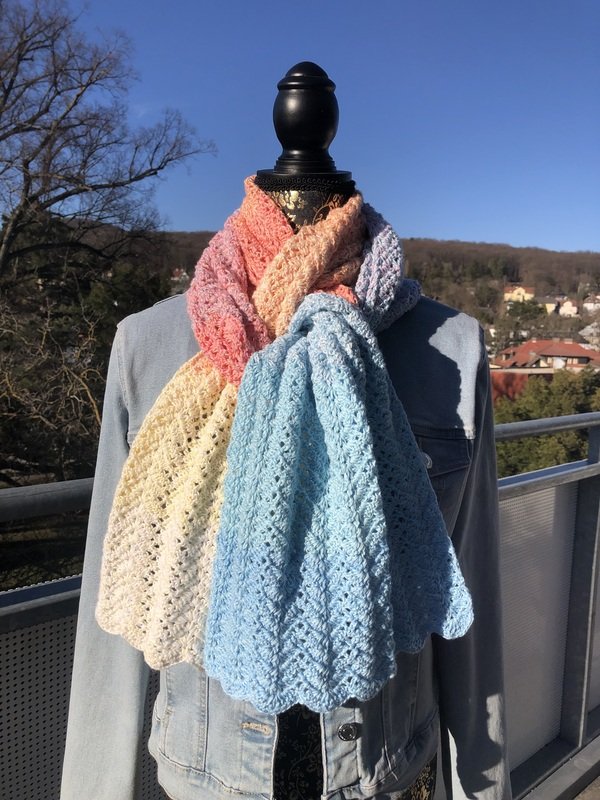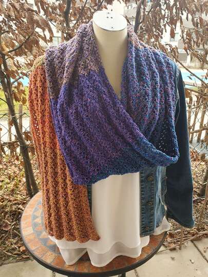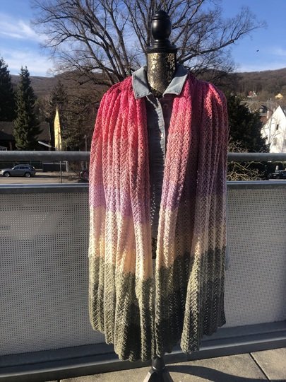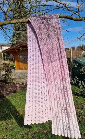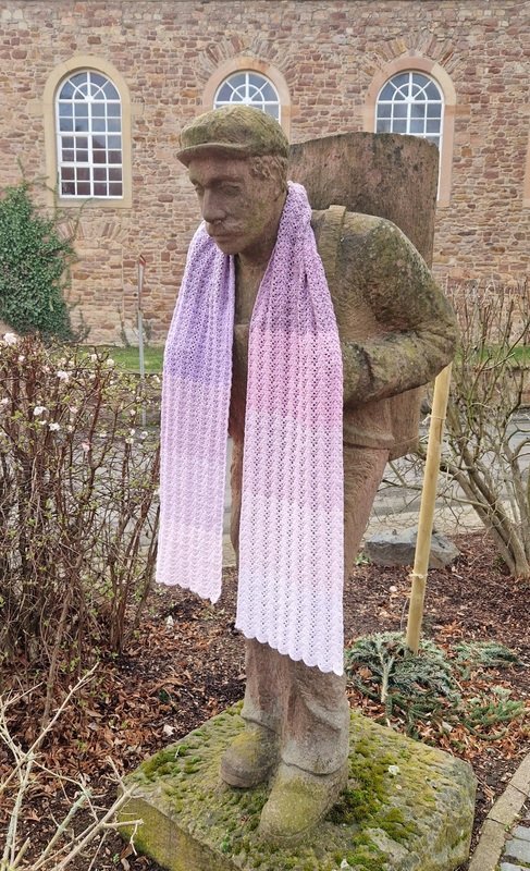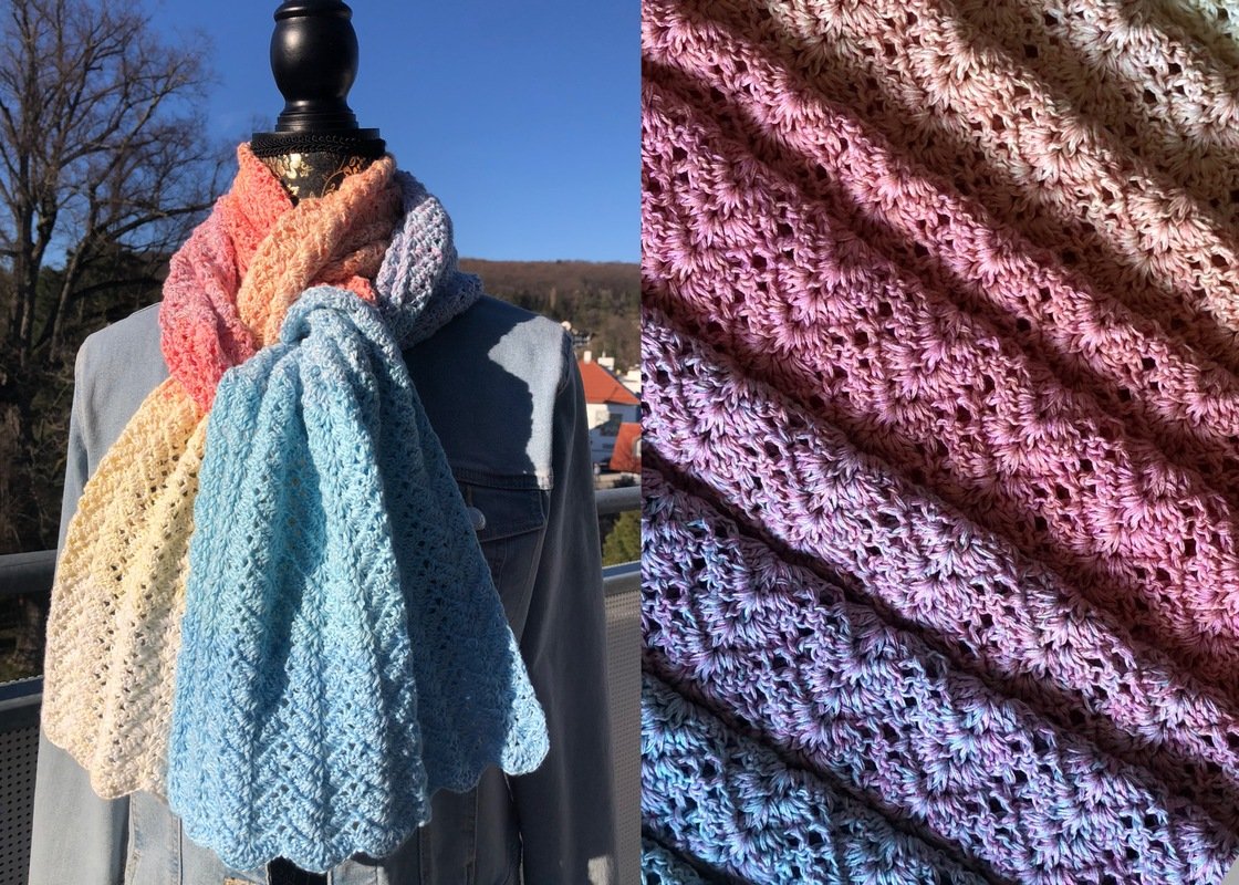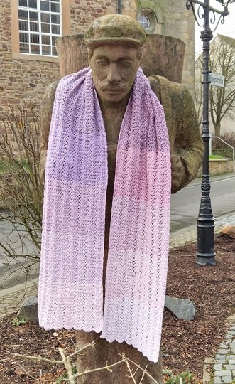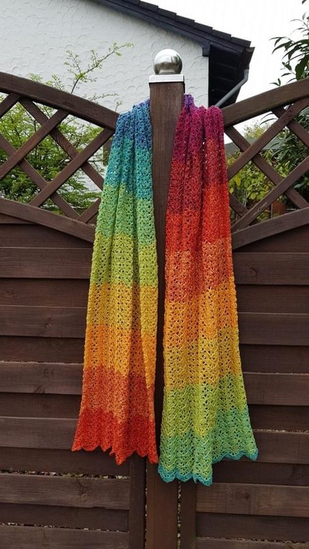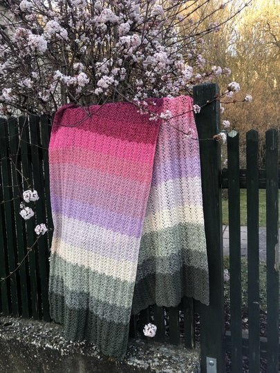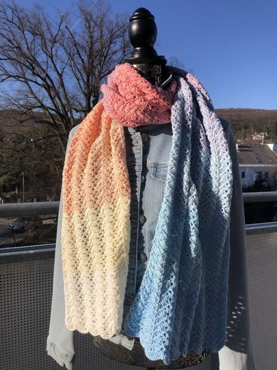 Der Schal kann in beliebiger Größe gearbeitet werden. Eine übersichtliche Tabelle mit Richtwerten ist in der Anleitung enthalten.