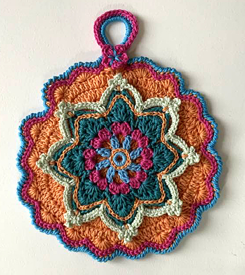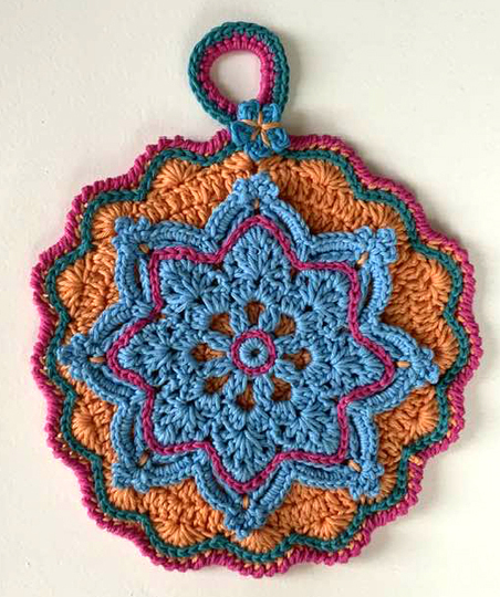 Petra Perles Topflappen Nr. 1 hat ( bei der Wollestärke 50 gr- 80 m ) einen Durchmesser von 24cm