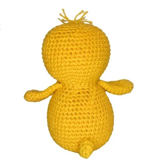 Das Küken wurde aus 100% Baumwolle gehäkelt mit Nadelstärke 3 und misst bei der