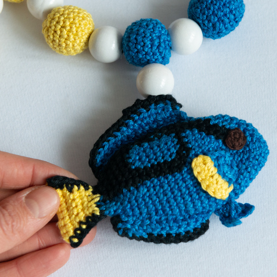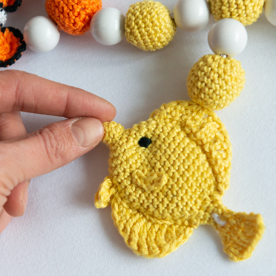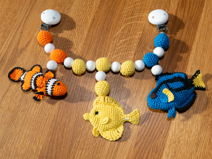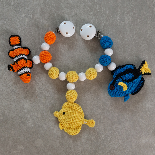 Tauche ein in eine faszinierende Unterwasserwelt und erschaffe mit dieser zauberhaften Häkelanleitung eine Kinderwagenkette, die von den Tiefen des Ozeans inspiriert ist! Diese einzigartige Kreation lässt Babyaugen staunen und entführt sie in die farbenfrohe Welt der Korallenfische. Mit drei naturgetreuen Fischen in leuchtendem Orange, strahlendem Gelb und tiefem Blau verzaubert diese Kinderwagenkette mit ihrem detailgetreuen Design.