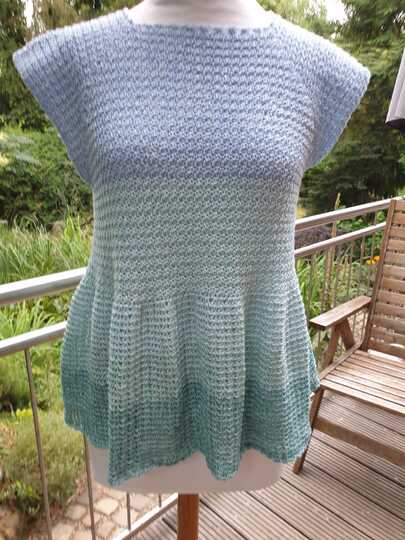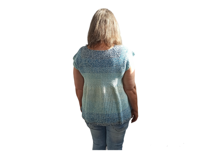Die „blauwe zomertuniek“ (NL für blaue Sommer Tunika) ist als RVO gearbeitet und kann so an jede Größe angepasst werden, auch kann der untere Teil individuell gestaltet werden …
