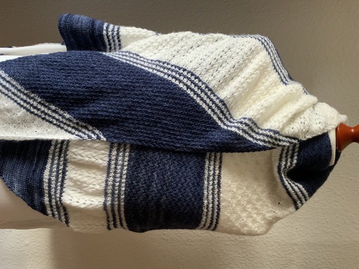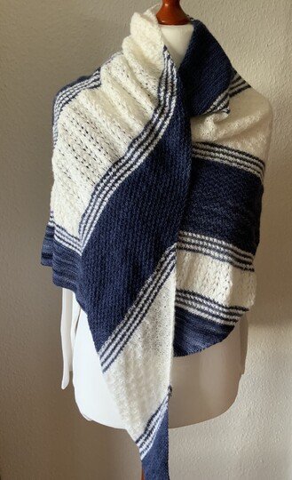 „Caprice“ ist ein leichtes, recht großes asymmetrisches Tuch mit unterschiedlichen Mustern und Streifen.