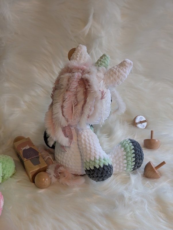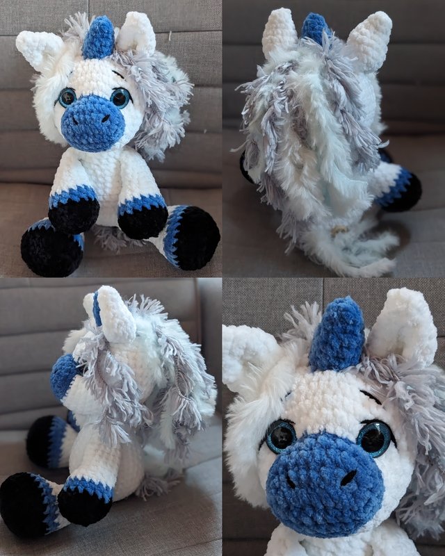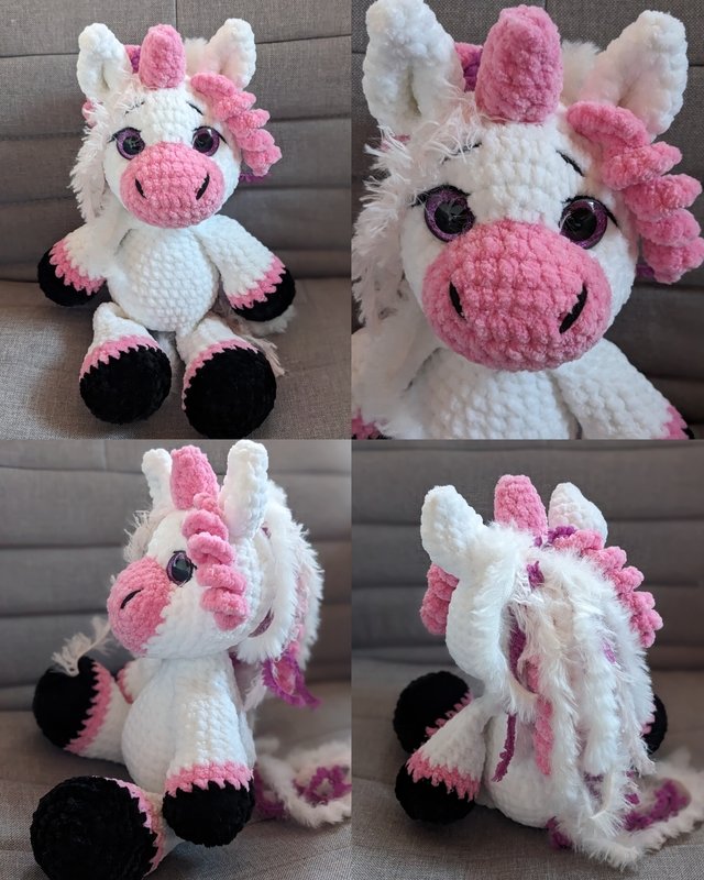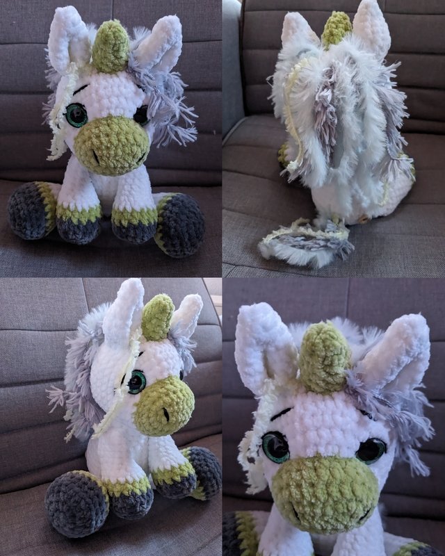 Besonders schön ist, dass man bei diesem Einhorn ausschließlich den Kopf und das Horn annähen muss. Arme und Beine und Ohren werden im Verlauf eingehäkelt.