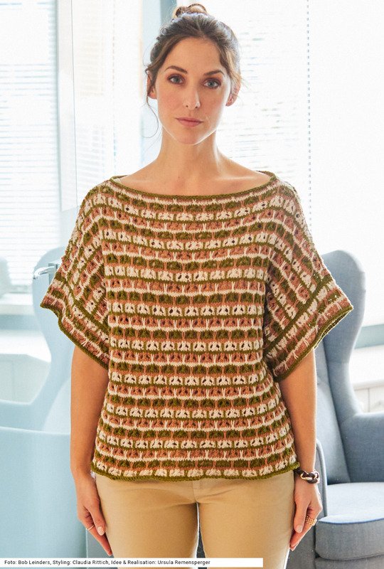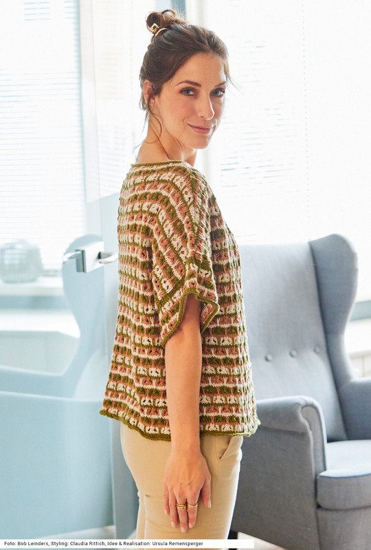 Perfekt gestylt ist man mit diesem Set aus Pulli und Tasche aus einem Baumwolle-Leinen-Garn. Die schmalen Streifen des Hebemaschenmusters werden abwechselnd in Khaki, Leinen und Hellbraun gearbeitet. Die kurzen Ärmel werden direkt an die an Vorder- und Rückenteil bereits angestrickten überschnittenen Ärmel genäht. Auch bei der gehäkelten Tasche wechseln sich diese Farben ab. An den Seiten bekommt sie noch Quasten aus allen Farben. Der stabile gehäkelte Henkel wird mit Metallringen an der Tasche befestigt. Die Anleitung kann für die Größen 38/40, 42/44 und 46/48 und für die Tasche mit 28 x 36 cm downgeloadet werden.