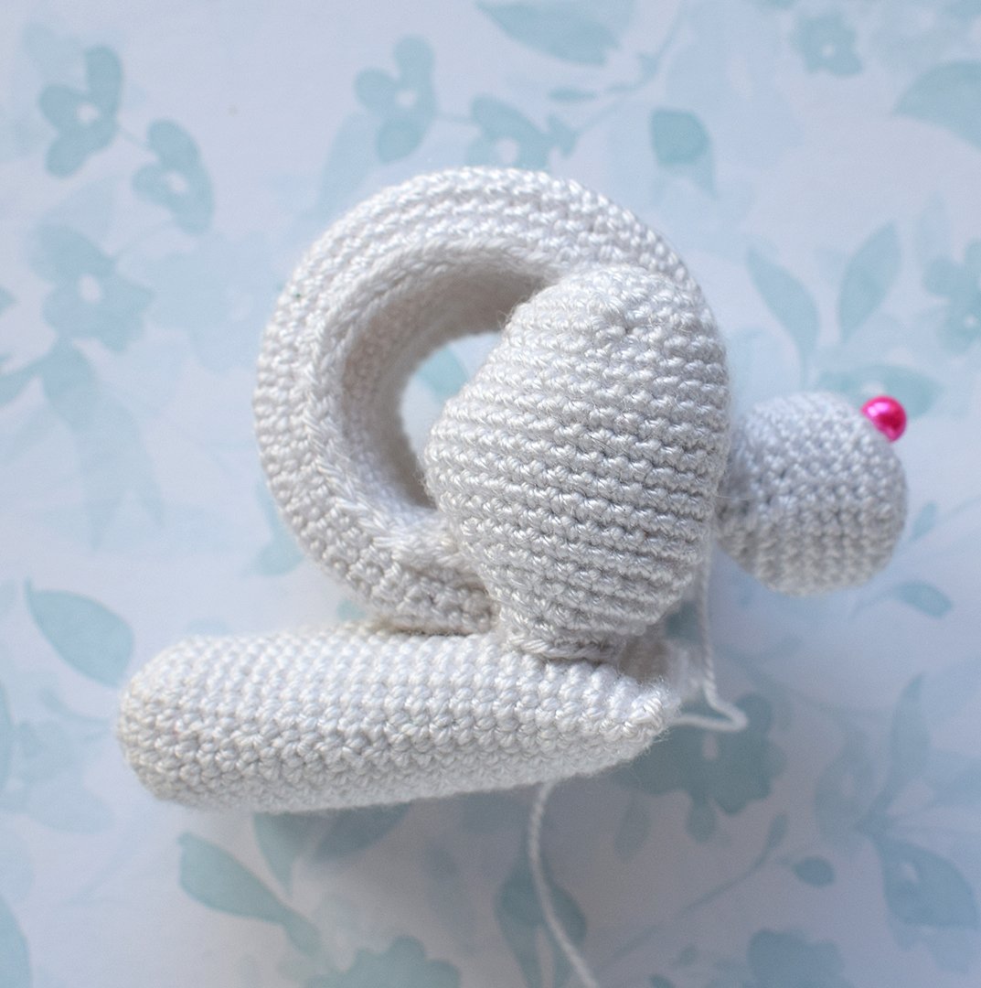 To sculpt the eye pits count 9 rounds from round 1 and put two dressmaking pins where the future eyes will be. Leave 11 sc between the pins. Follow the pictures for guidance.