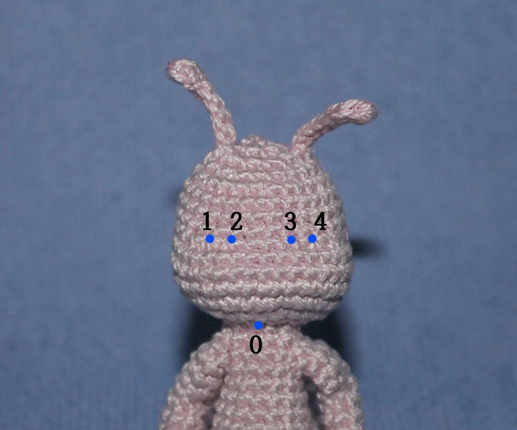 Attach pink colour yarn into the spot where the body divides itself into two parts. See the picture for guidance, the spot is marked with the red dot.