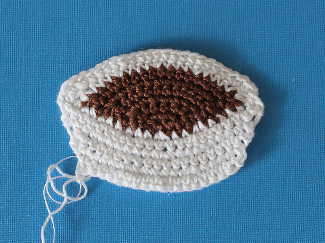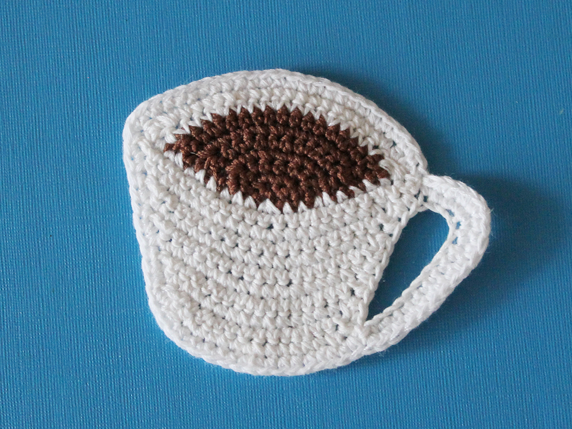 Make the second piece with the main color yarn (white in my case). This is the back of the cup. Do not cut the white yarn!