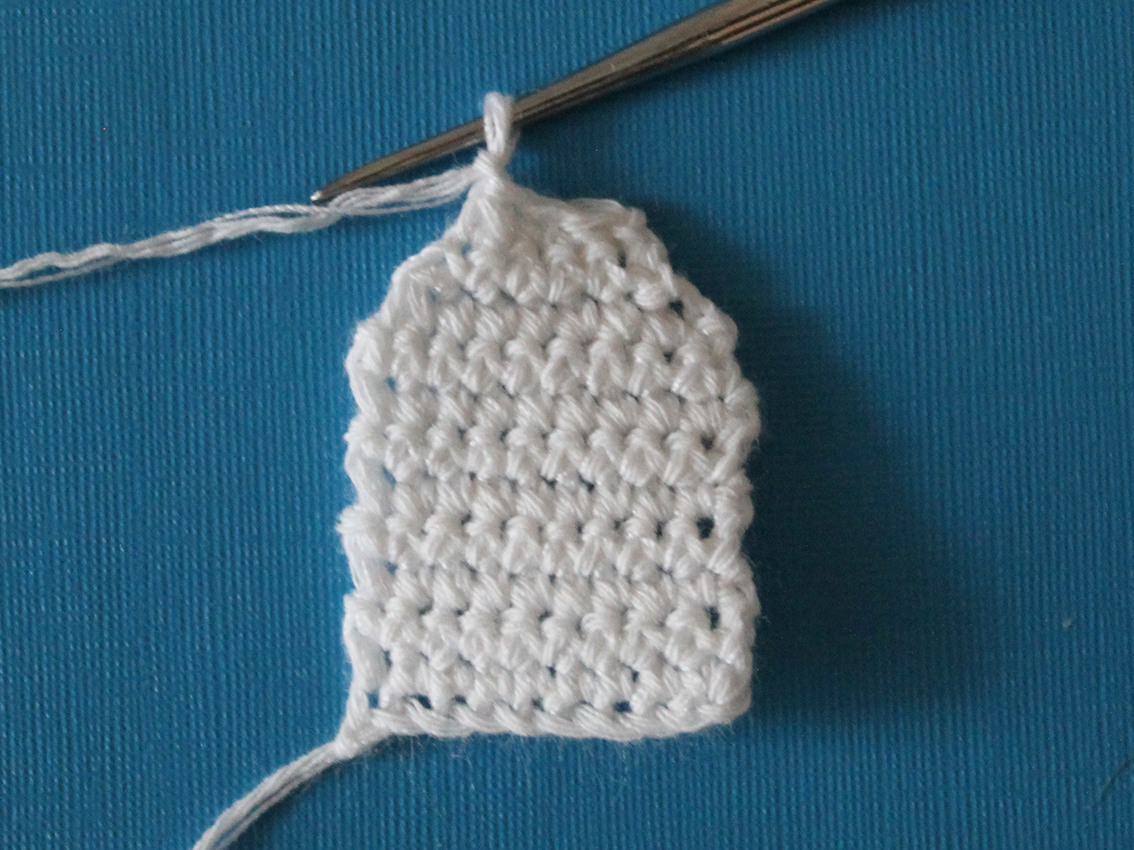 8) 1 hdc, (3 sc, inc) х 3, 4 sc, 1 hdc, ch 2, turn (21)
