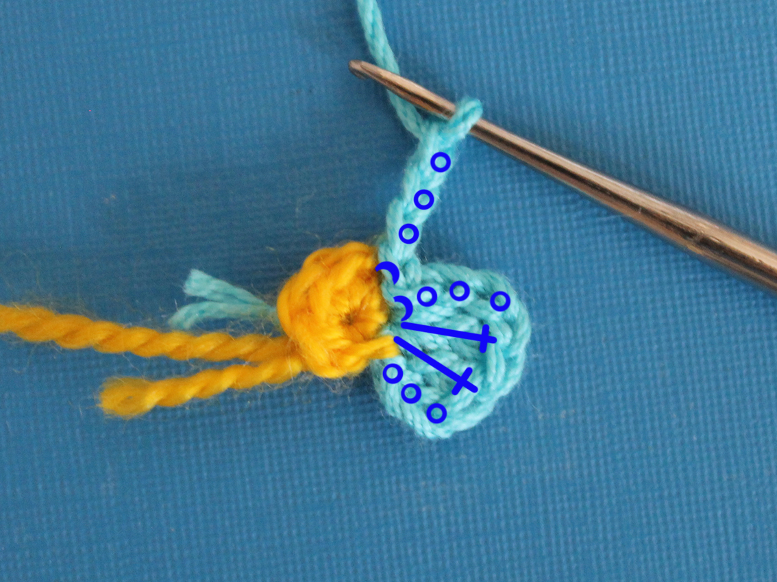 2) (ch 3, 2 dc, ch 3, 1 sl st) in 1 st; 1 sl st in the next st) repear 5 times (see pict).
