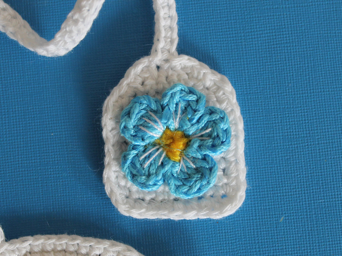 At point B, C, D, A make 2 sc in 1 stitch. End with a sl st at point B. Fasten off and hide ends.