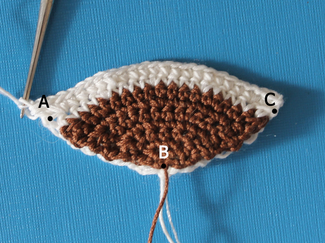 10) 1 hdc at point A, 9 sc from point A to point B, 2 sc at the point B , 9 sc from point B to point C, 1 hdc at point C, ch 1, turn (22)