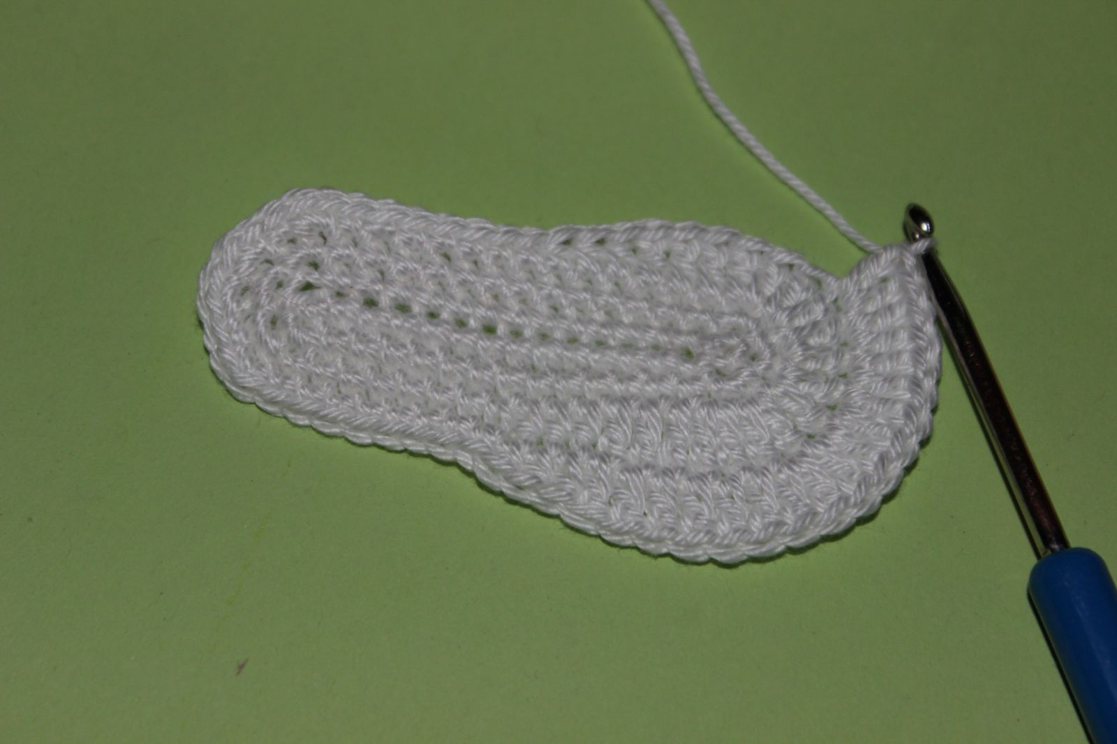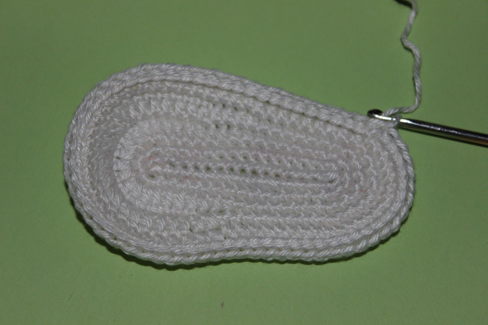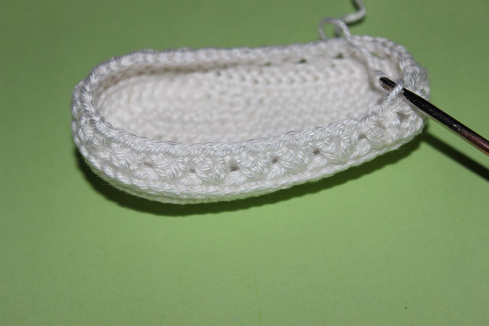 Around the sole crochet: ch 1, sc and dc in the same st as ch, *ch 1, skip 1st, sc and dc in next st*, repeat from*to* till the end of round, cut the yarn.