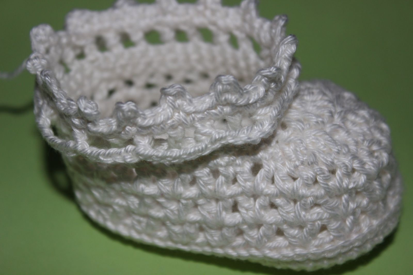 Weave ribbon through spaces between dc´s and decorate booties as desired.