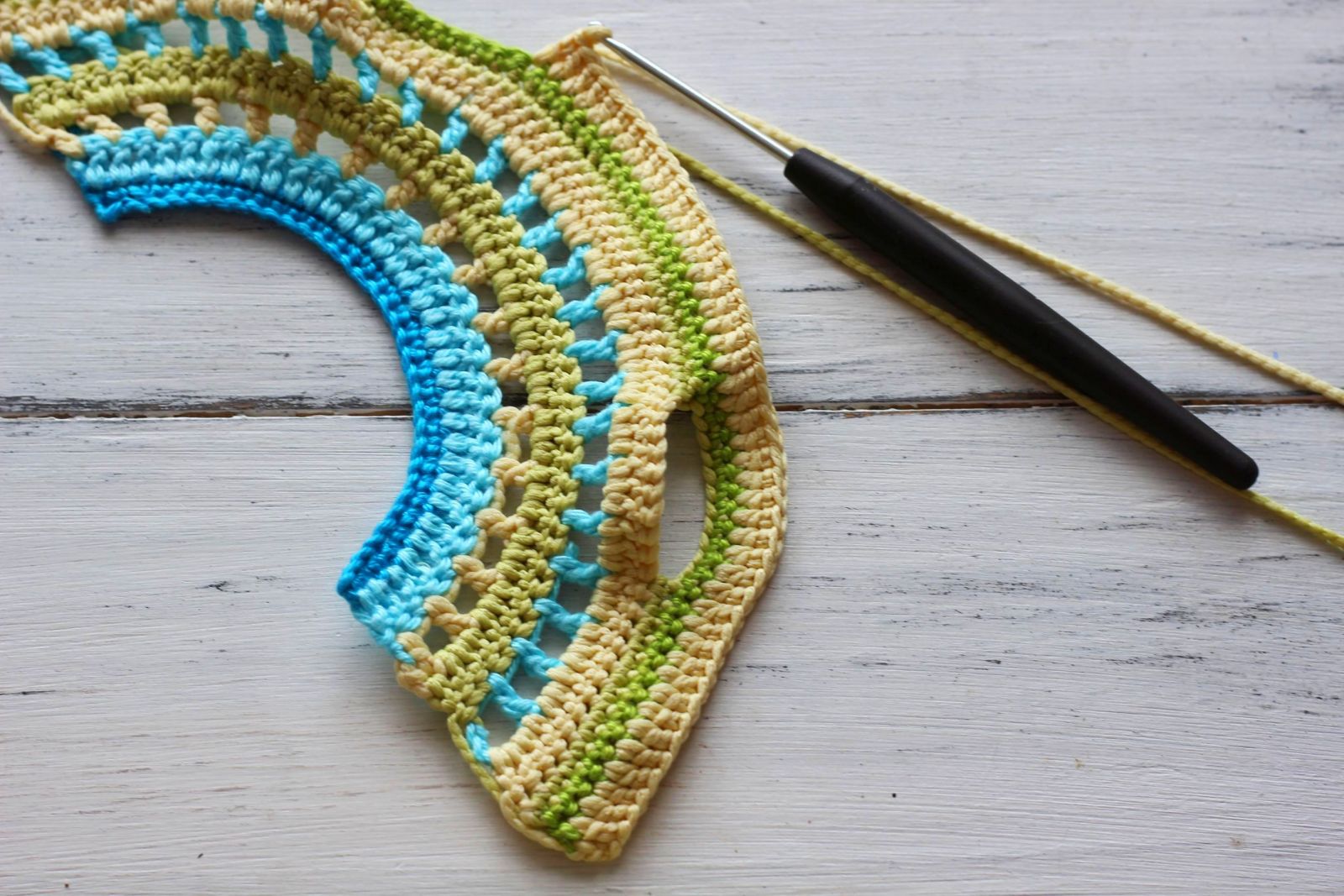 Row 7: sc in each of next 13 sts (back), cast on 10 stitches, then skip next 10 sts (armhole), sc in each of next 30 sts (front), cast on 10 stitches, then skip next 10 sts (armhole), sc in each of next 13 sts (back), turn the work.