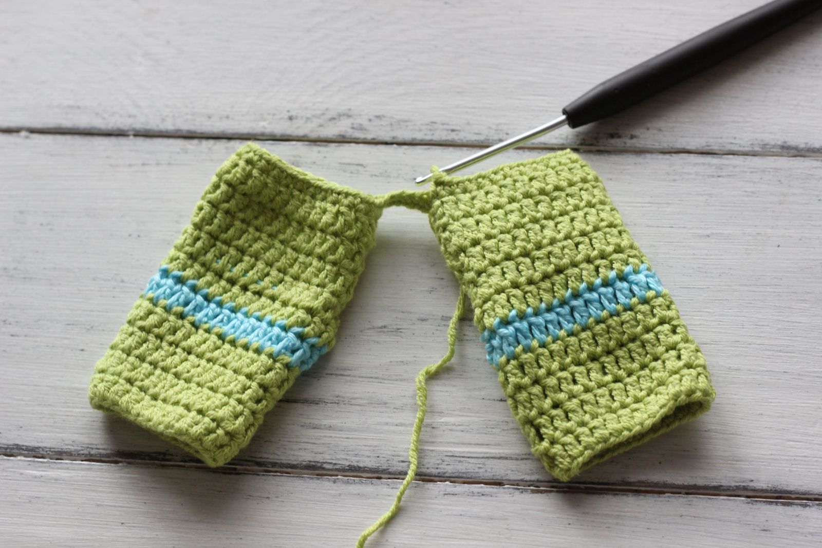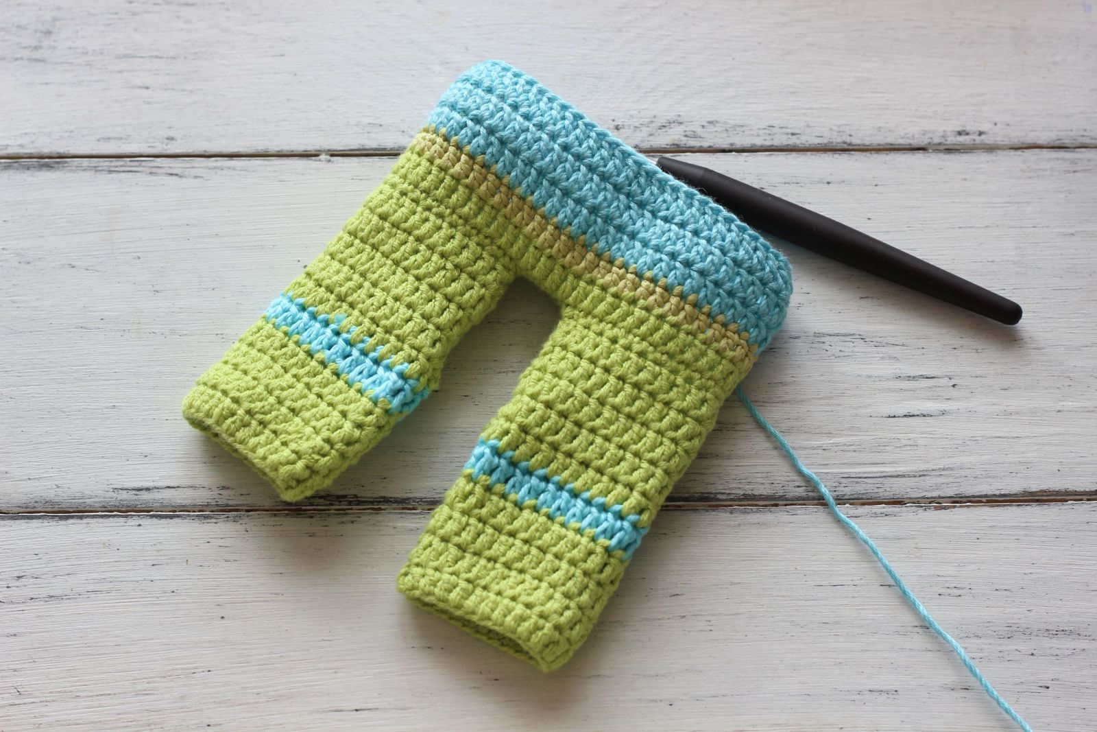 Rnd 11: chain 4 stitches, work one round over both legs (24 stitches  of the first leg, sc in each of next 4 sts, 24 stitches of the second leg).