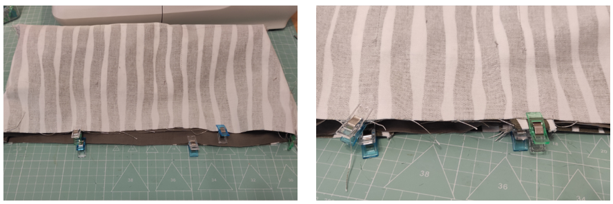 Now place this fabric piece on an outer piece so that the lower cutouts are exactly on top of each other. Attach both pieces to each other with pins or Wonderclips and finish the edge of the pocket with a zigzag stitch (width 5mm, length 2 mm). In this way, the outer pocket is fixed to the outer fabric at the same time.