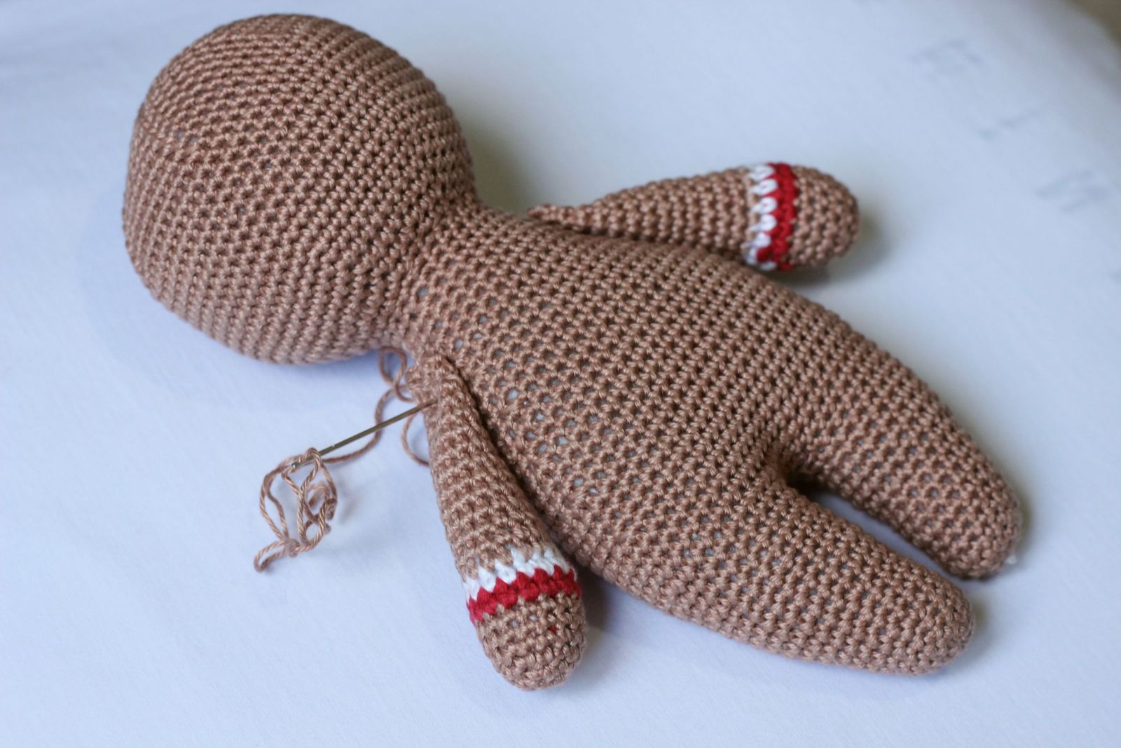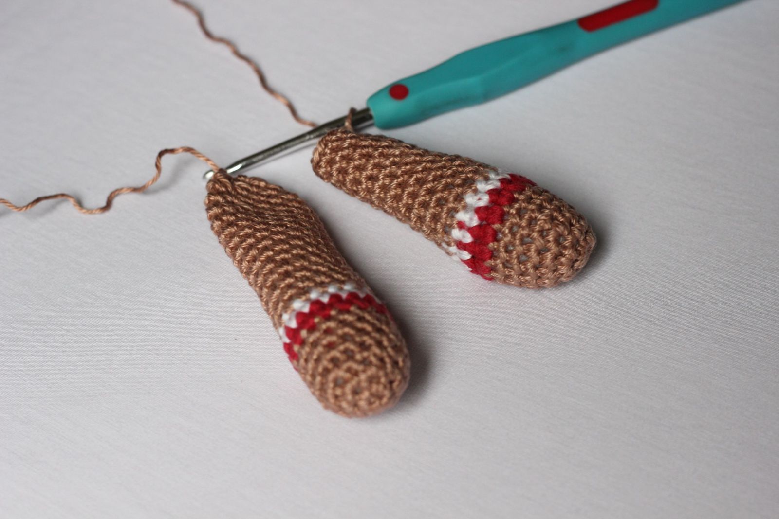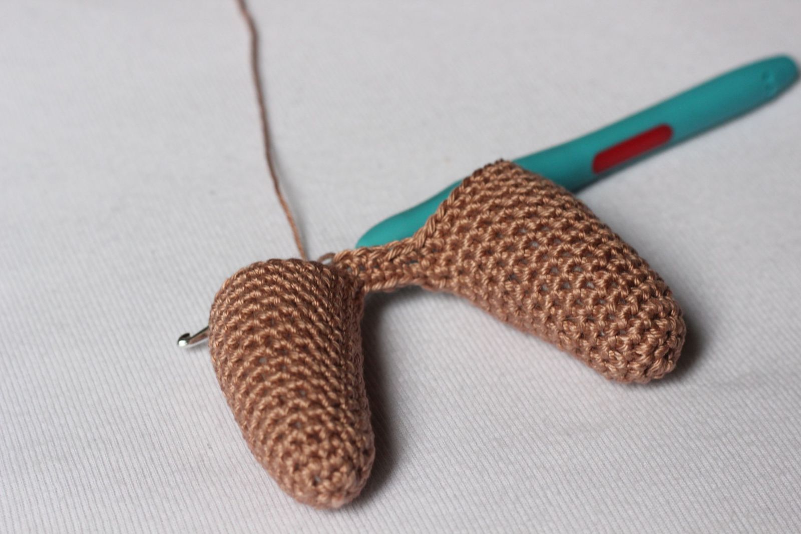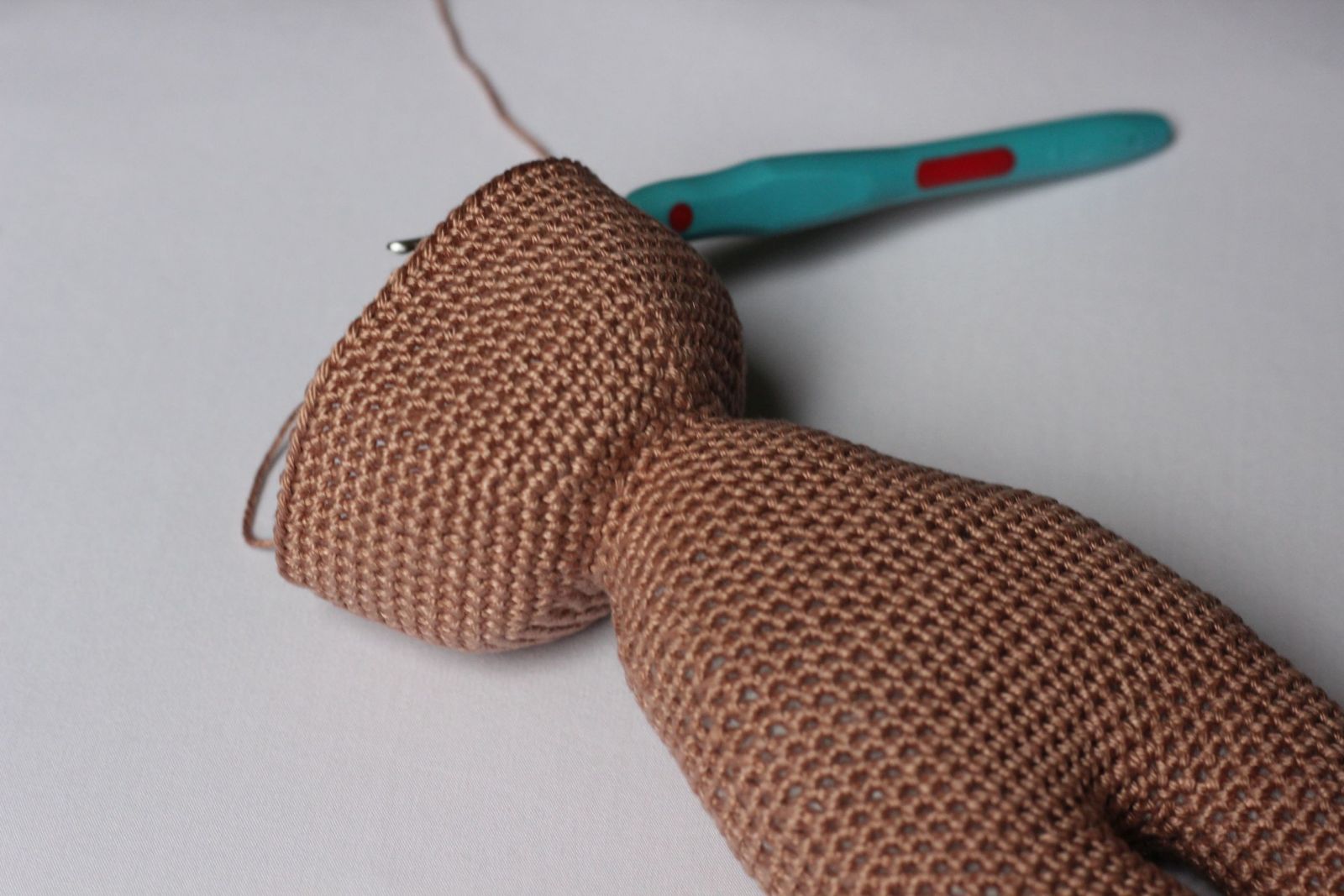 Rnd 16: chain 5 stitches, work one round over both legs (21 stitches of the first leg, sc in each of next 5 sts, 21 stitches of the second leg)