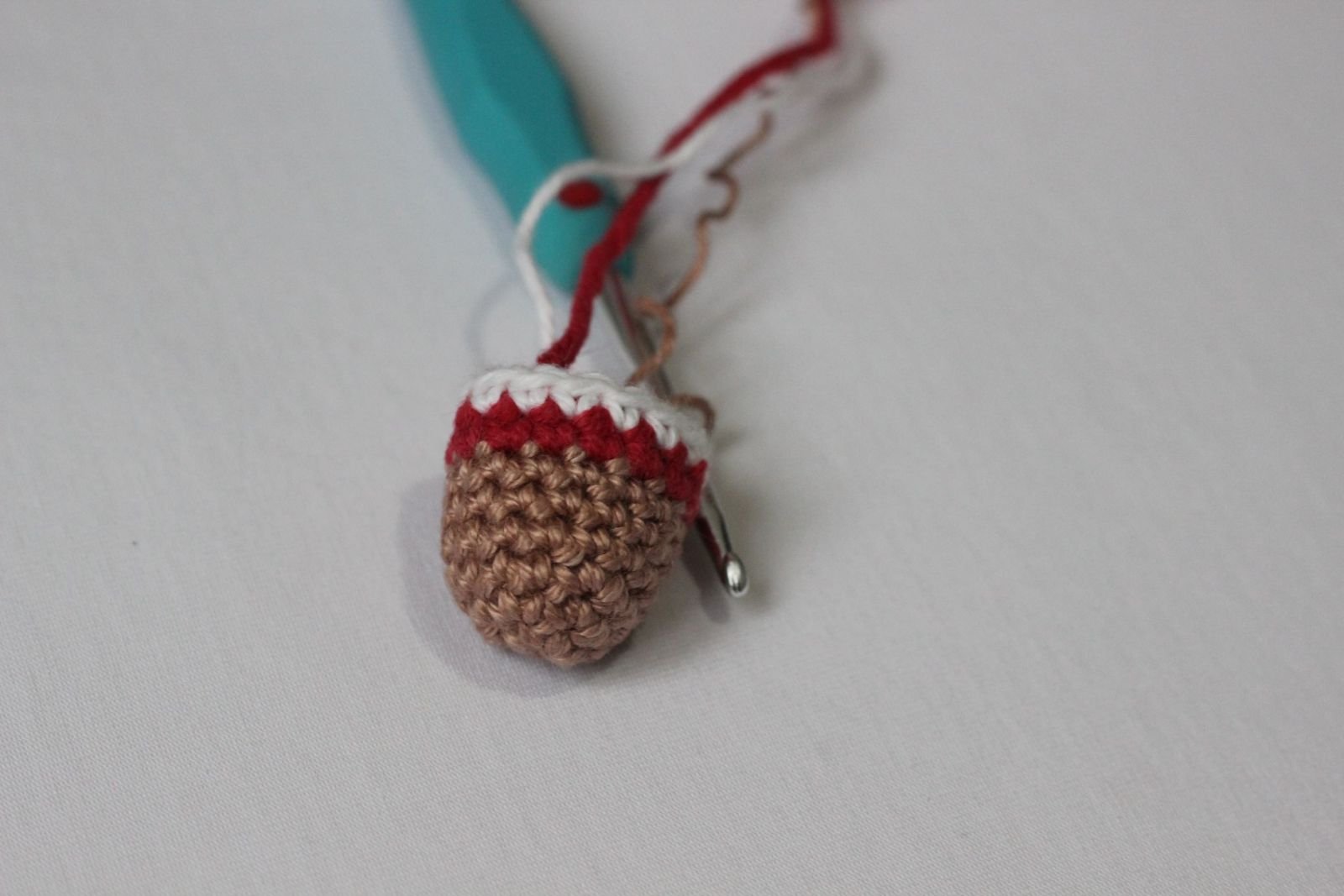 cotton yarn (e.g. Schachenmayr Catania 125m/50g) in three colors: brown, red and white, crochet hook 3 mm, Polyester fiberfill stuffing, 2 black beads or safety eyes, white bead, scissors, yarn needle, aliminum wire, wire cutter.