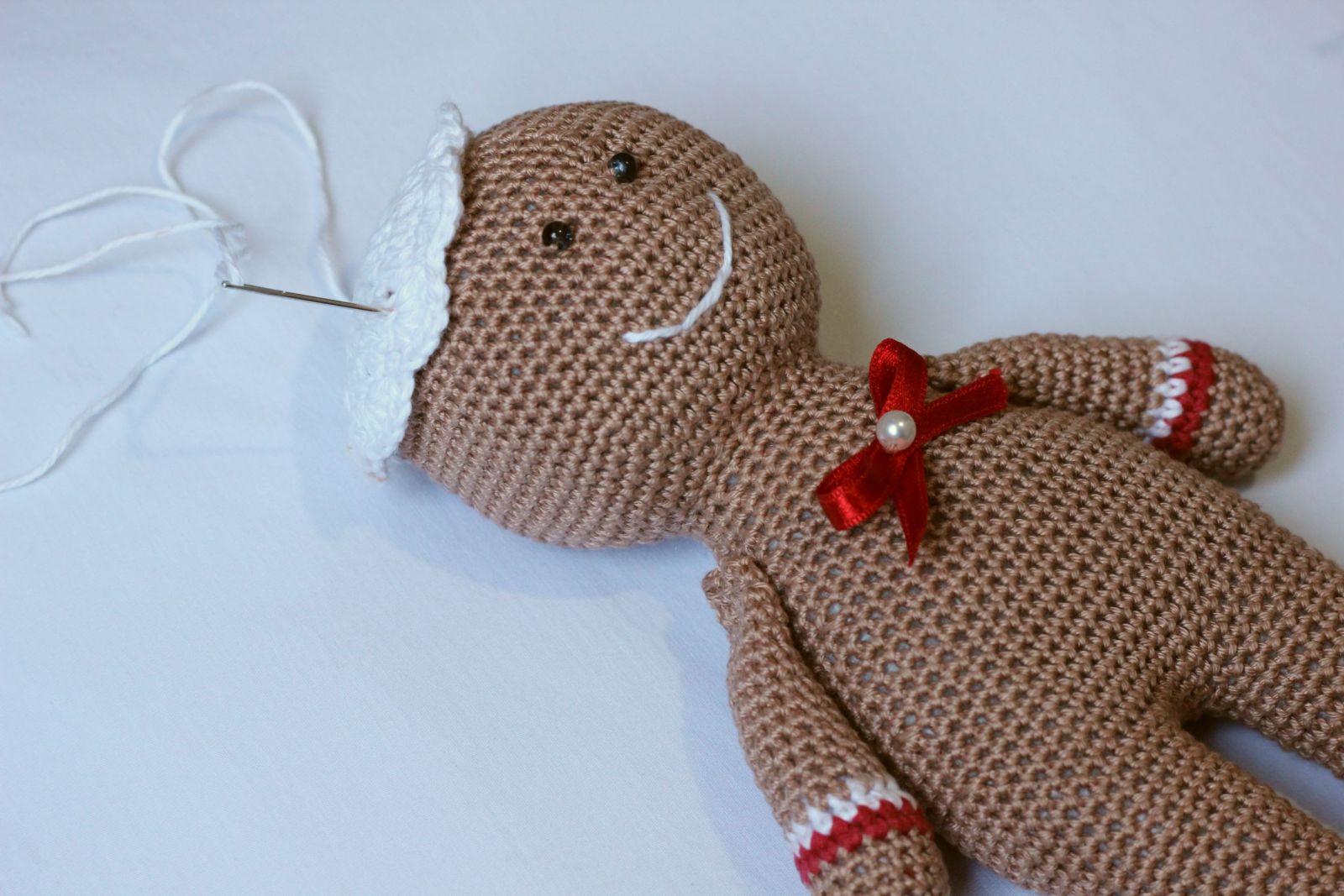 Sew bead and satin ribbon on the body of the gingerbread man.