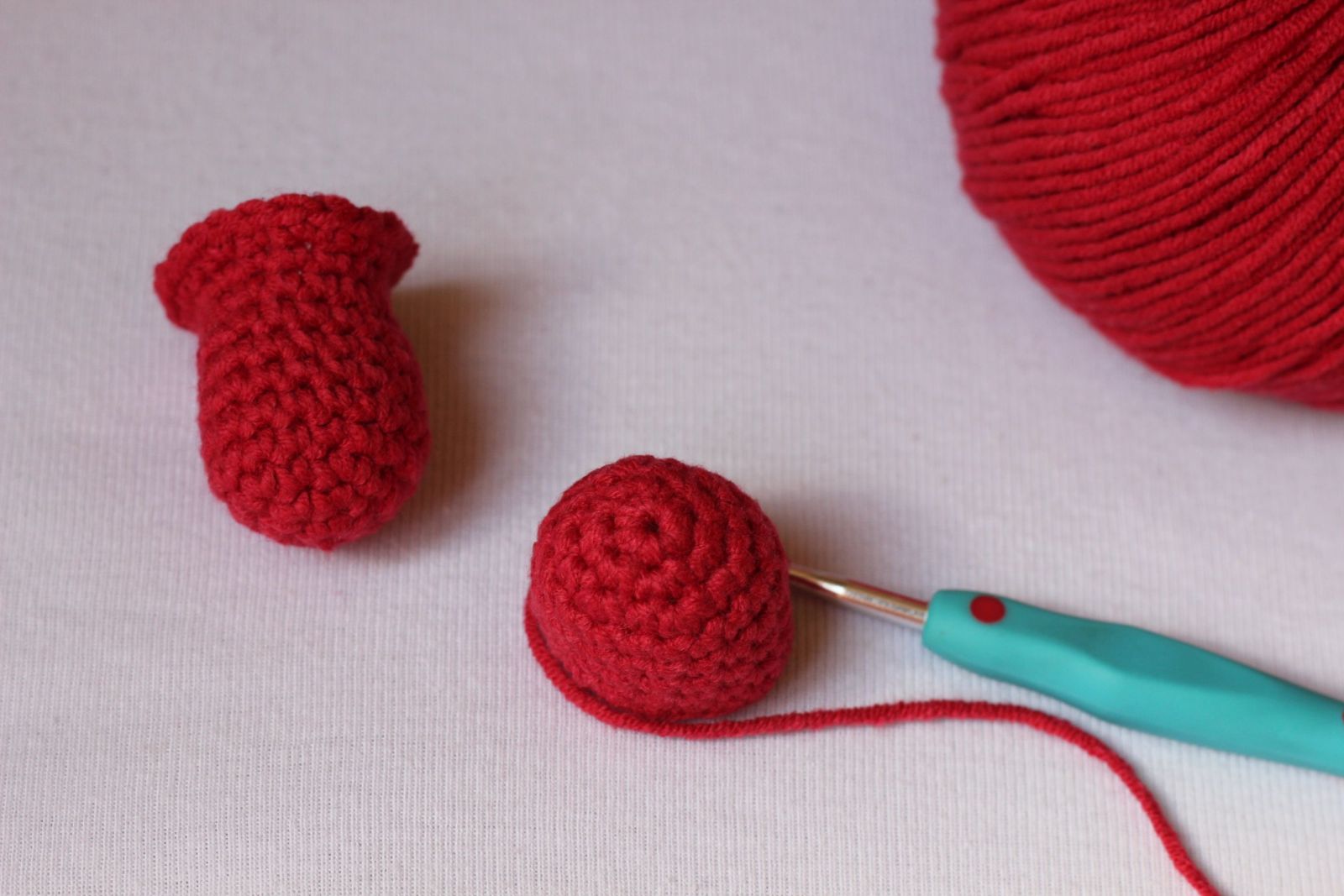 cotton yarn (e.g. Schachenmayr Catania 125m/50g) in three colors: black, red and white, crochet hook 3 mm, Polyester fiberfill stuffing, 2 black beads or safety eyes, white bead, two buttons, scissors, yarn needle, aliminum wire, wire cutter.