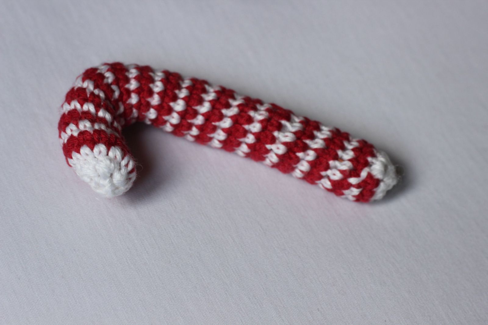 Bind off and sew the last 6 sts close. Weave in all your ends. Finally, model your candy cane by bending the aluminum wire.