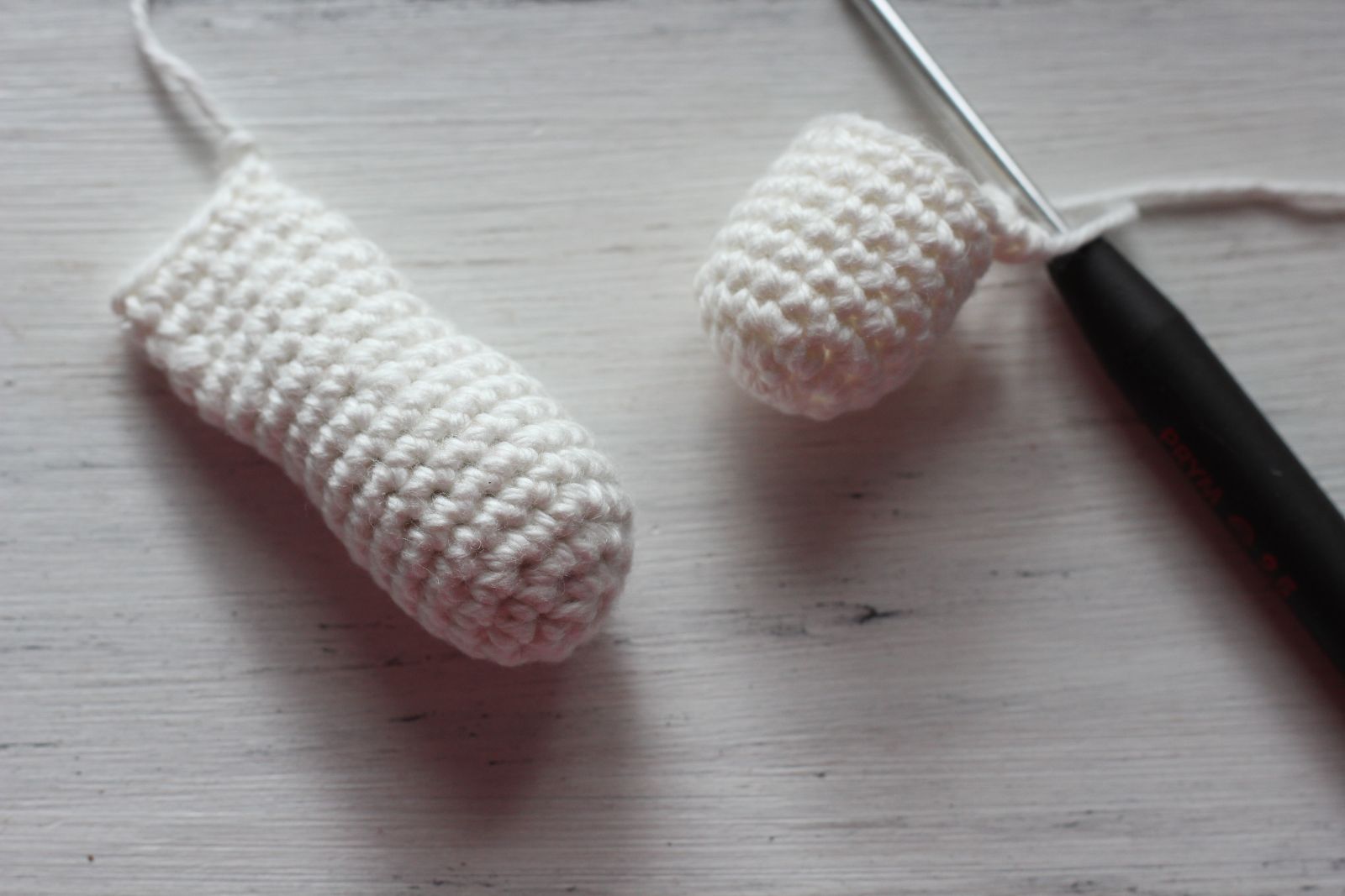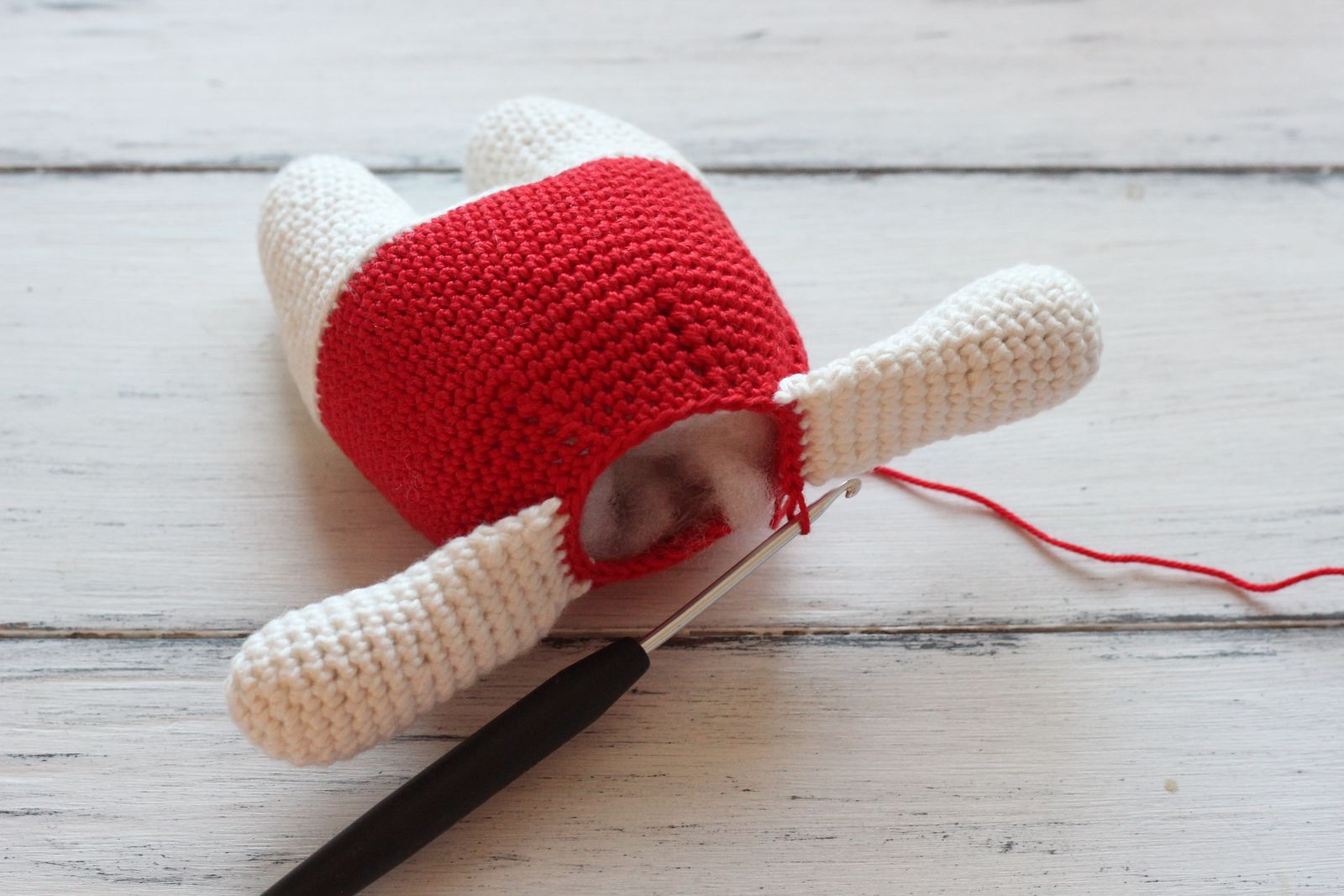 Bind off the first leg. Work the second leg the same way but don´t cut the yarn as we will join the legs together to make the body. Stuff both legs firmly.