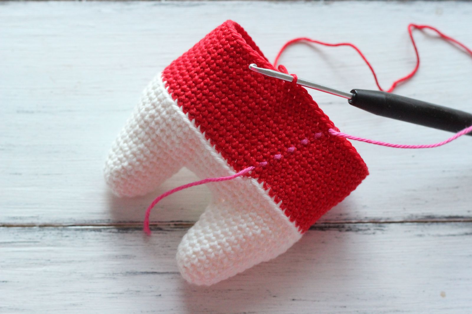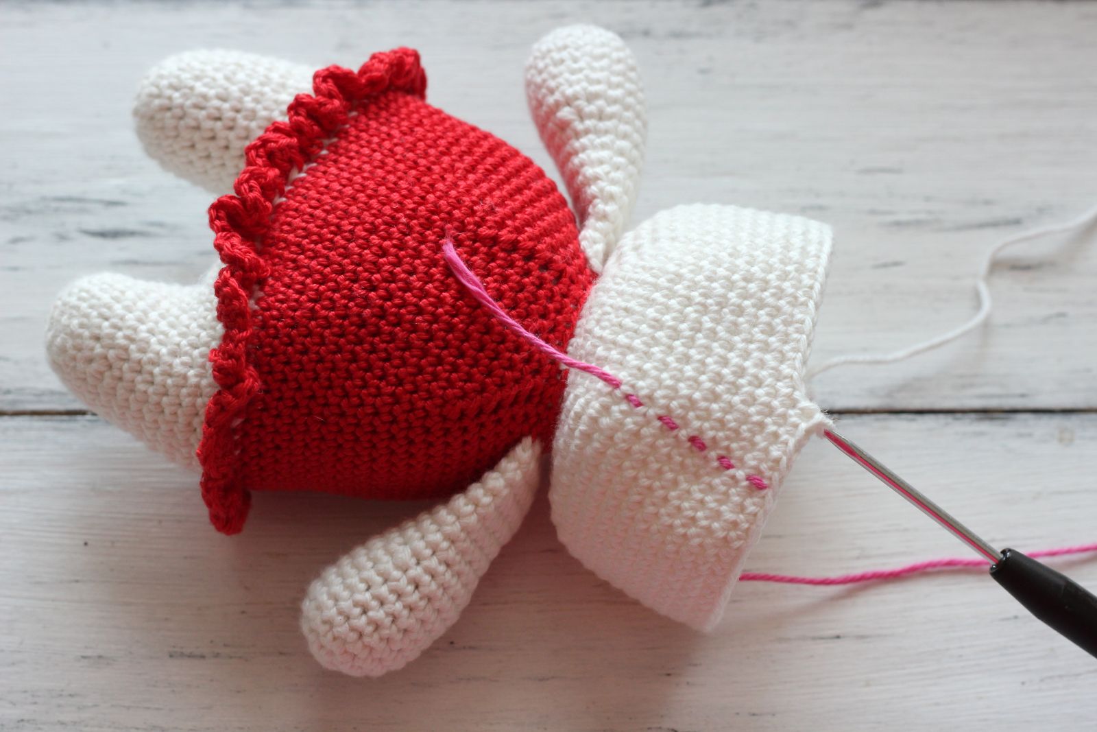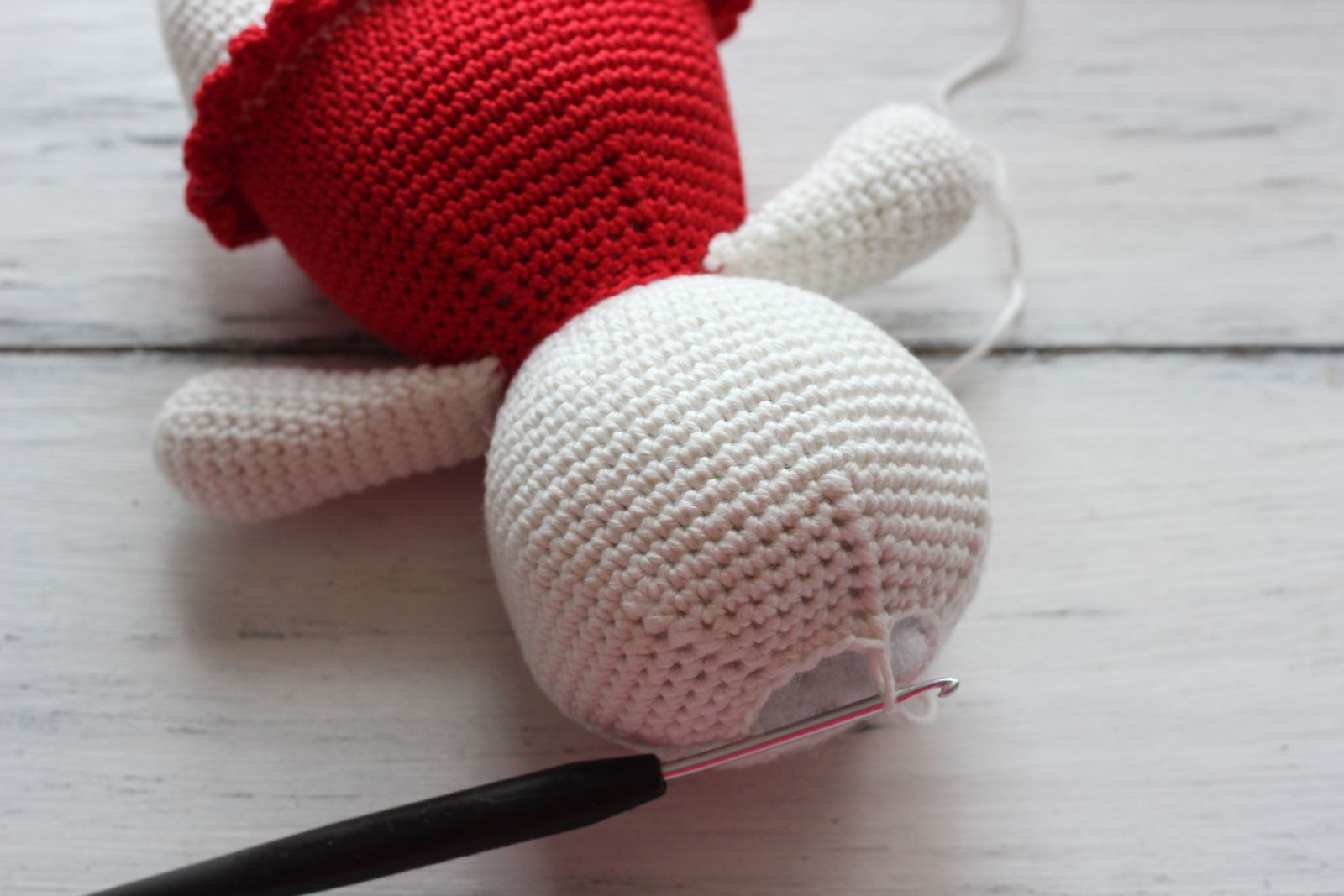 cotton yarn (e.g. Schachenmayr Catania 125m/50g) in two colors: red color and white, a bit of brown or black yarn for the eyes, a bit of beige for the hat and rose for the mouth, crochet hook 2,5 mm, Polyester fiberfill stuffing, scissors, yarn needle
