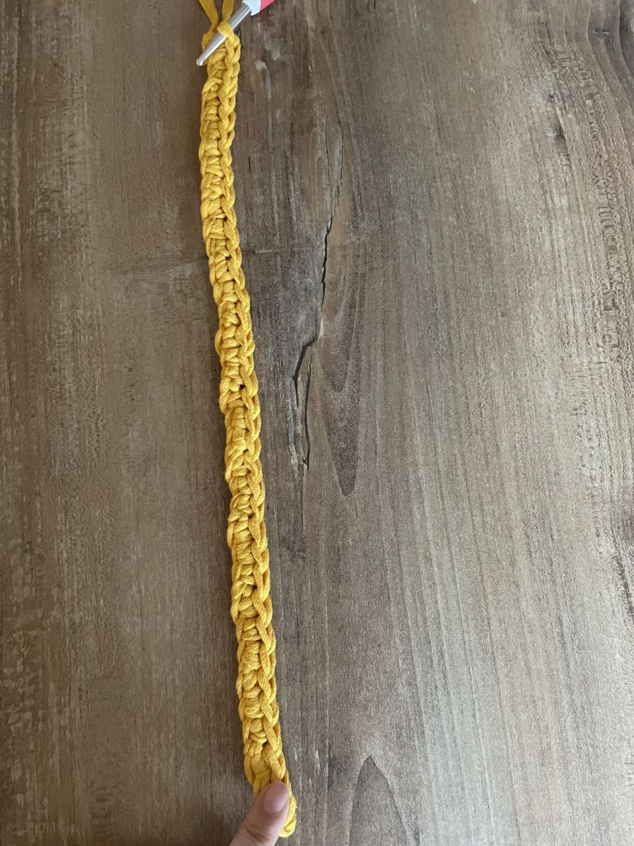 Row 4: Repest Row 3, ensuring that the deep single crochet is made over the stitch that was not a deep single crochet before (48). In this row, prepare the ribbon for closure and size adjustment. This means this row ends with a chain of six air stitches. Then turn.