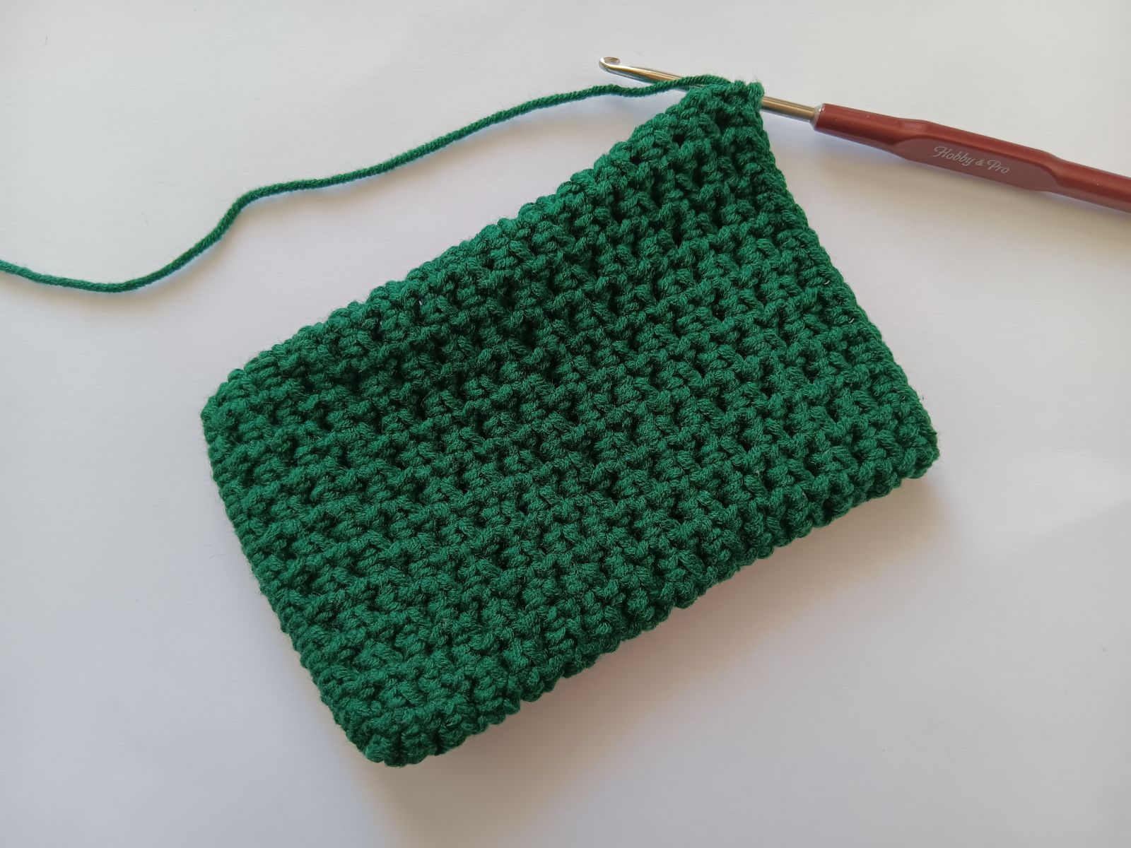 This pattern is designed to hold 6”x3”, which are approx. the dimensions of iPhone. You can make the pattern larger (or smaller) by changing the yarn weight and/or hook size or by adding rounds.