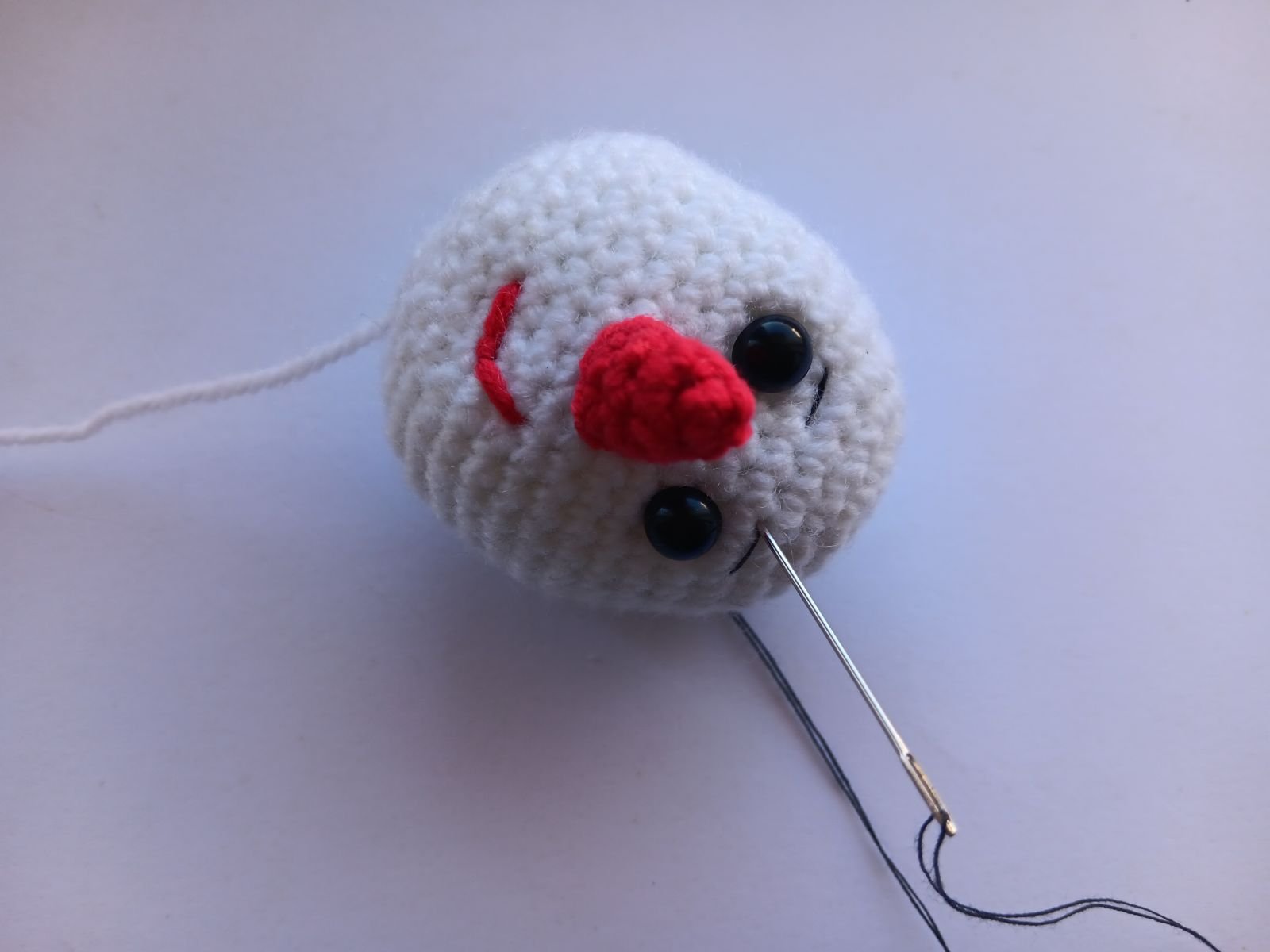 Use pins to position the nose on the head of the snowman. Attach the nose to the head using yarn ends.
