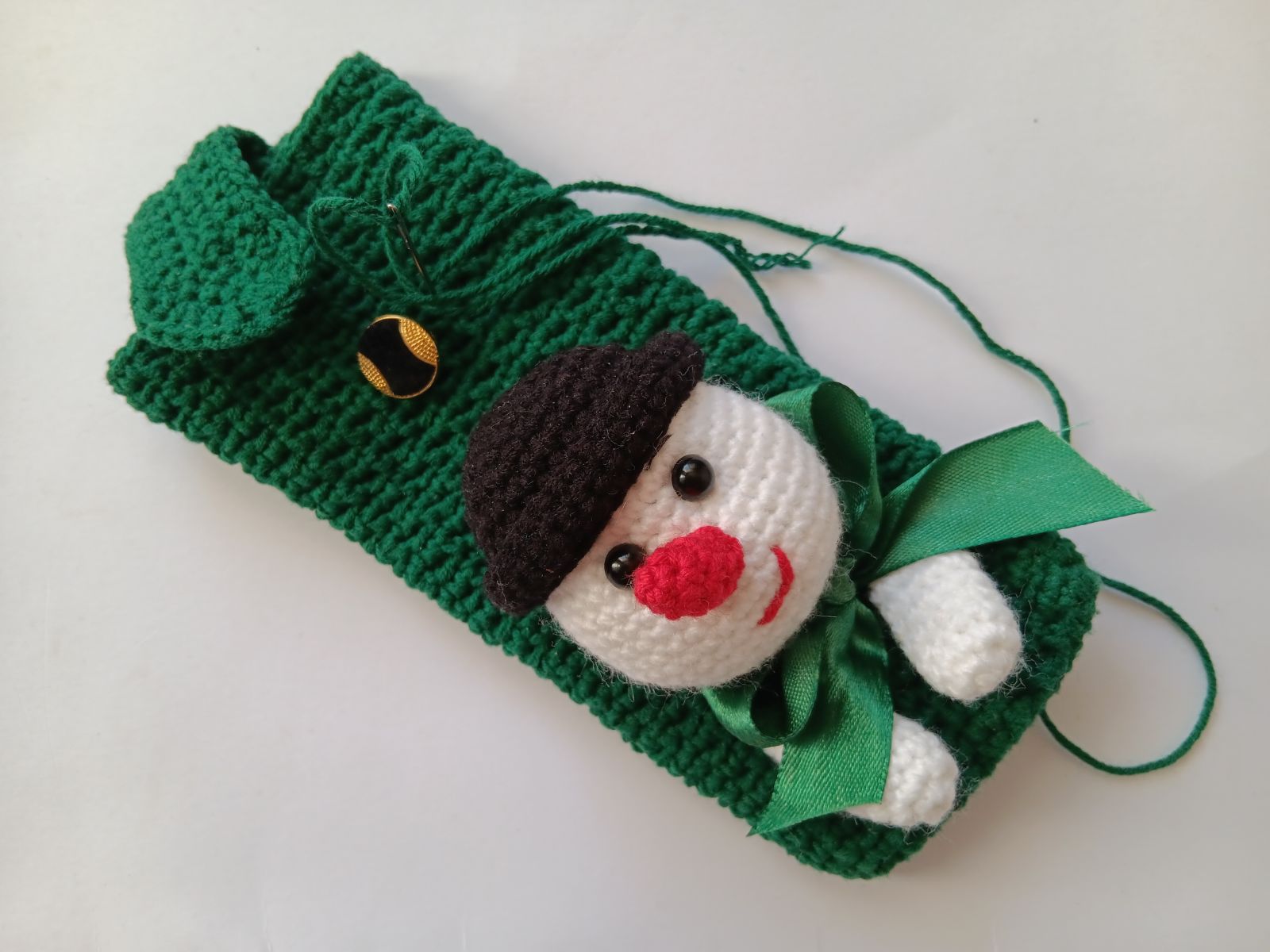 Sew hat onto the head. Sew the snowman to the pouch. Weave in all ends. Attach the button. Weave in all ends.
