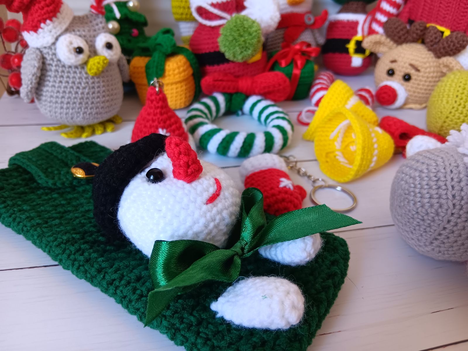 ca 50 gr cotton yarn (e.g. Schachenmayr Catania 125m/50g) in four colors: green, red, white for the snowman and black for the hat, crochet hook 2,5 mm, polyester fiberfill stuffing, chopstick or something similar to help with stuffing small parts, stitch marker, scissors, yarn needle, safety eyes or two black beads 5 mm, satin ribbon, one button.