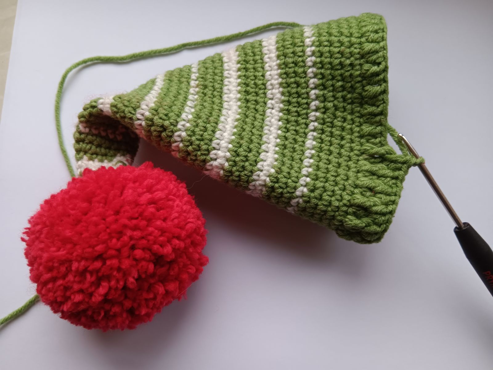 Make a pom pom using red colored yarn and attach it to the hat. Your Elf Hat is ready!