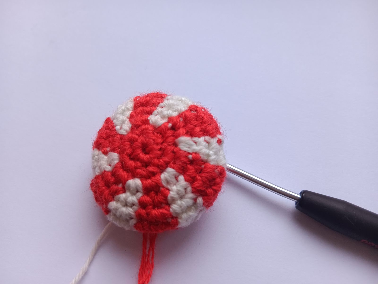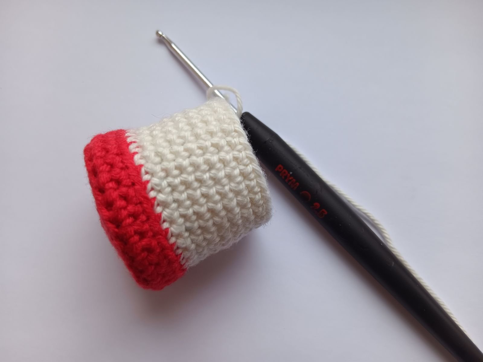Round 5-6: single crochet in each of next 36 stitches - 3 stitches in red and 3 stitches in white
