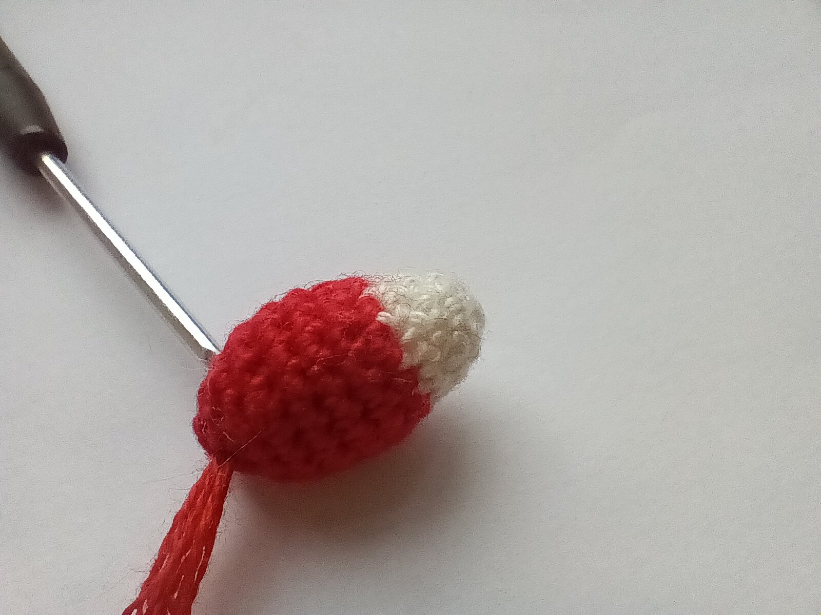 Round 7: *decrease, single crochet in the next stitch*: 2 stitches in red and 2 stitches in white (24 stitches)