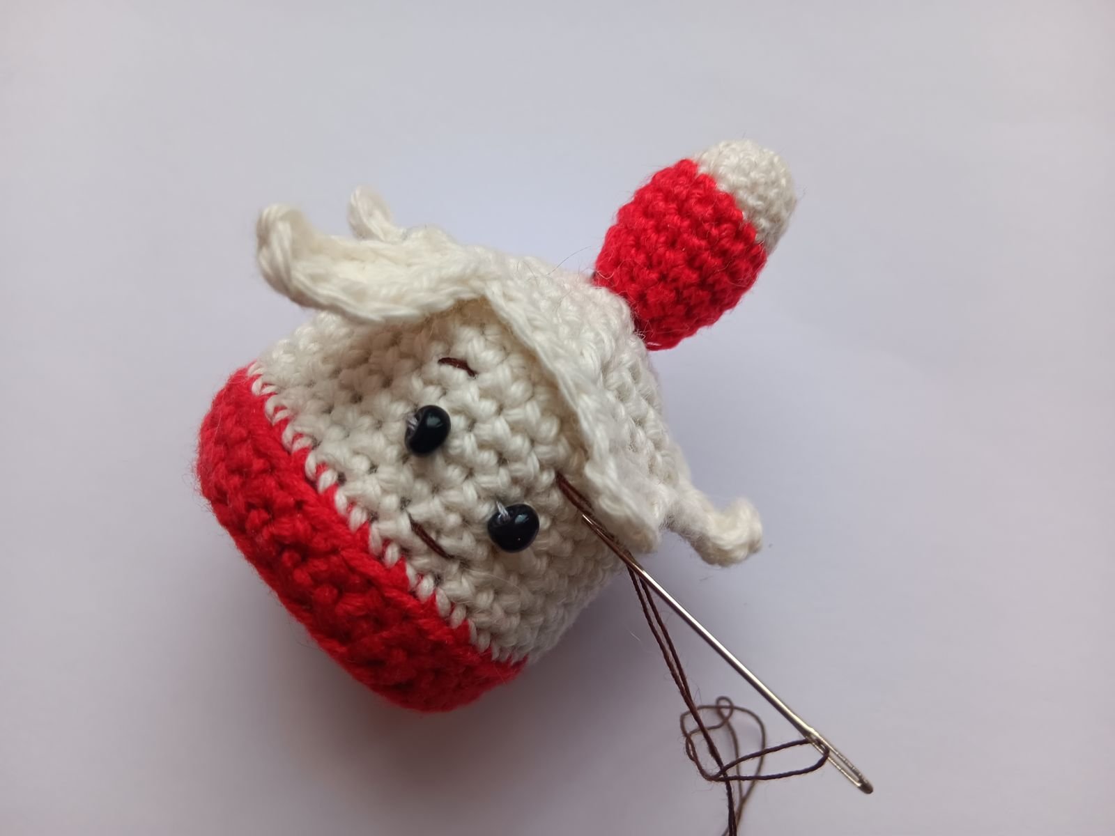 Eyes are attached now. Mark where you want the eyes to be placed with pins and sew them with the distance of 3-4 stitches to the your candle. Be sure to step back and take a look to make sure they are even. Embroider eyebrows and a mouth with black color yarn. Proceed a smile if desired. You can also add eyelashes. Hide the yarn tails inside the head. You can add some pink blush on its cheeks.