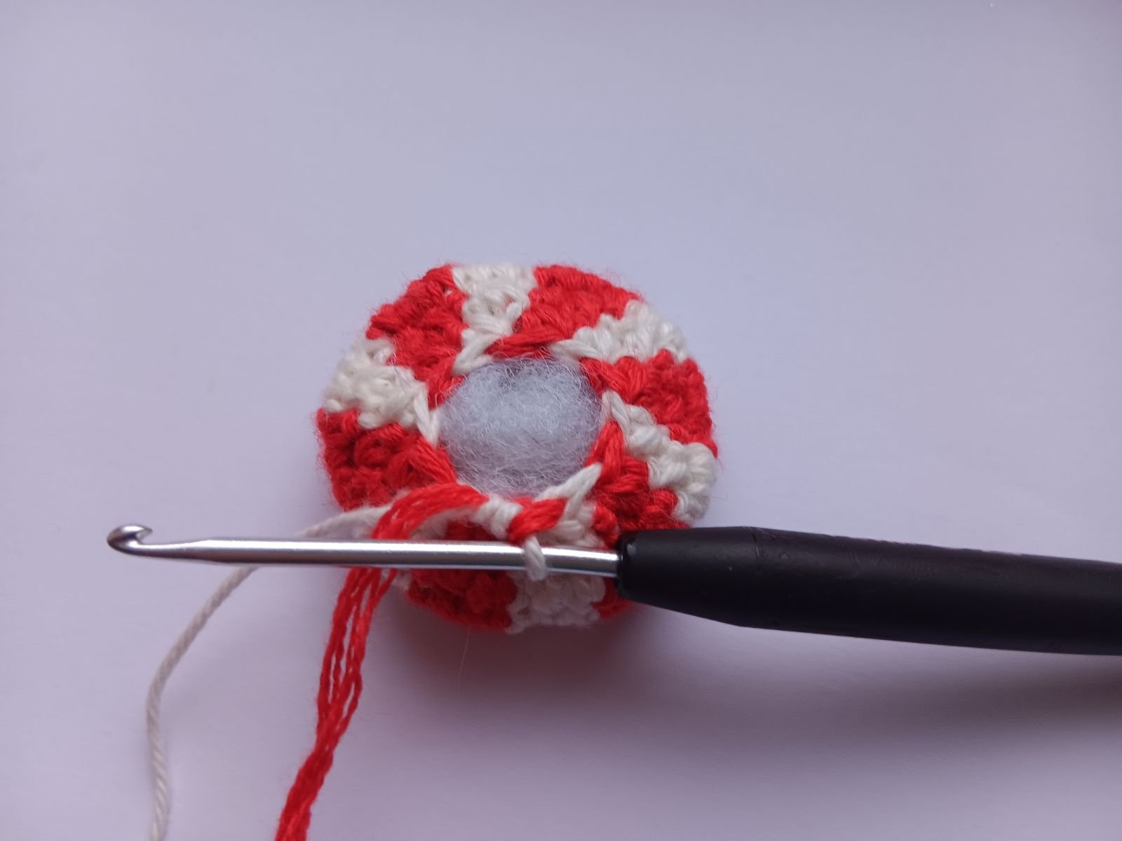 Round 2: 2 single crochets in each stitch around: 2 stitches in red and 2 stitches in white (24 stitches)