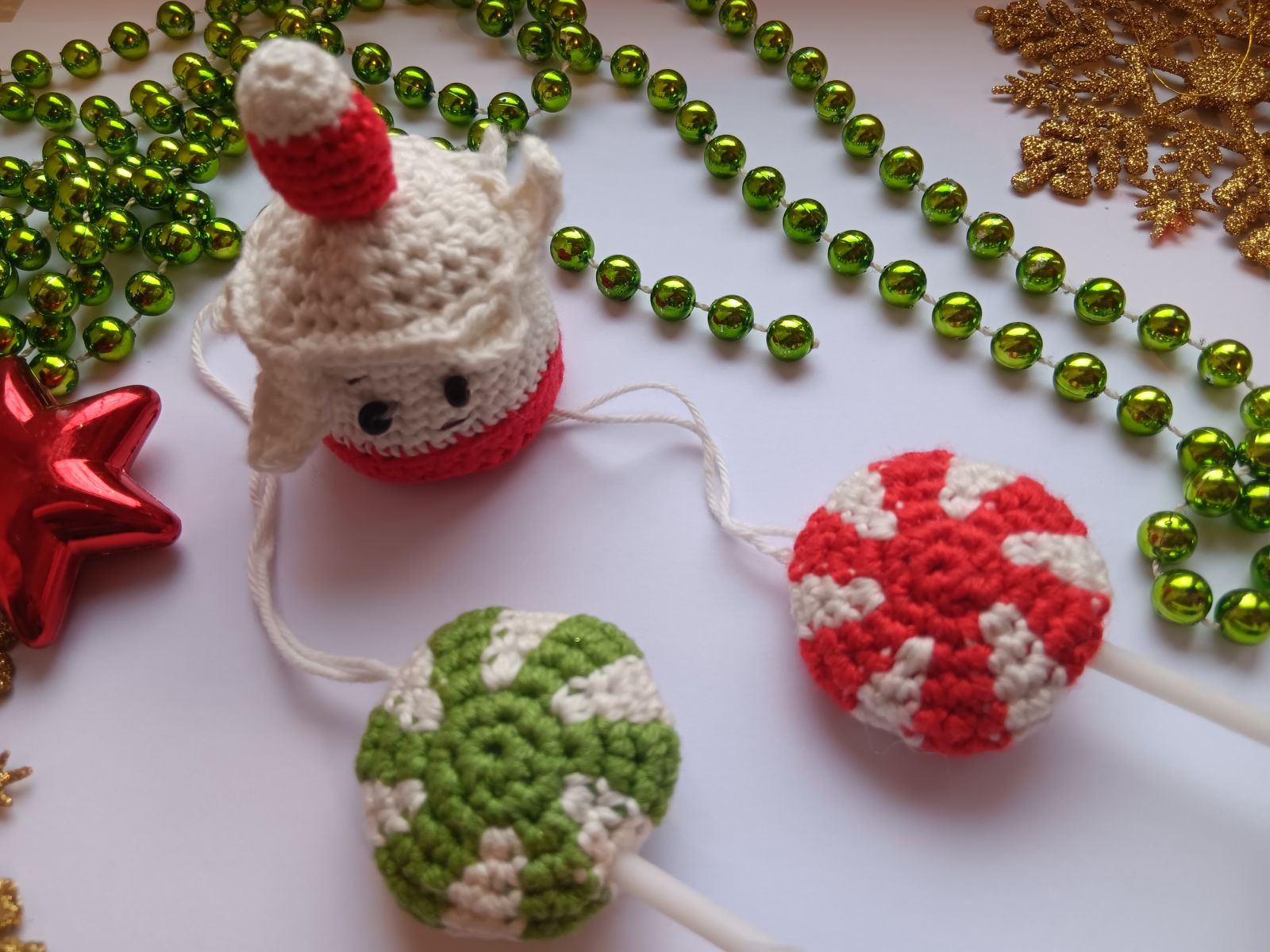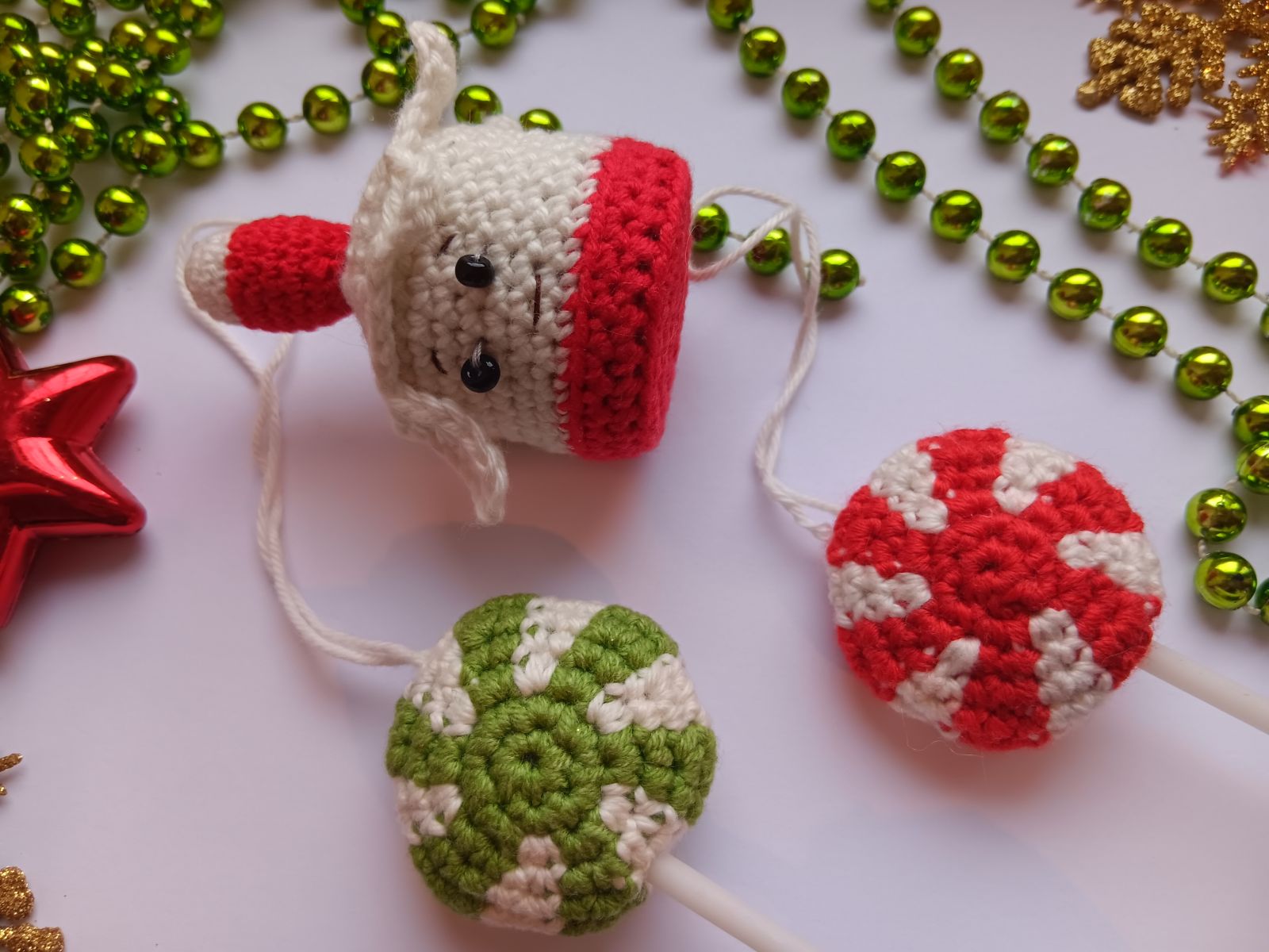This lollipop ornament crochet pattern might just be one of your favourites. Start crocheting with red colored yarn. The lollipop stick is sewn on at the end.