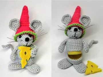 Ü-Ei-Wichtelmaus, die eine kleine Überraschung in sich trägt. Der Körper der Maus wird um eine leere Überraschungse-Plastikhülle gehäkelt. So kann man die Maus am Bauch öffnen und eine Kleinigkeit darin verstecken.
