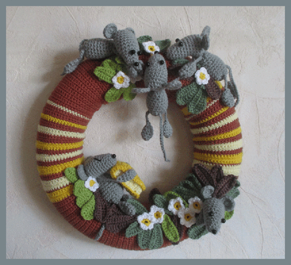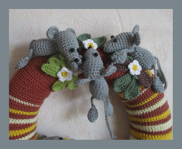 Crochet cotton: 2 x gray, 1 x light yellow, 1x dark yellow, some black, 1x dark green, 1 x light green, 1 x white, 1 x dark brown