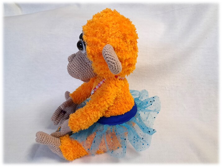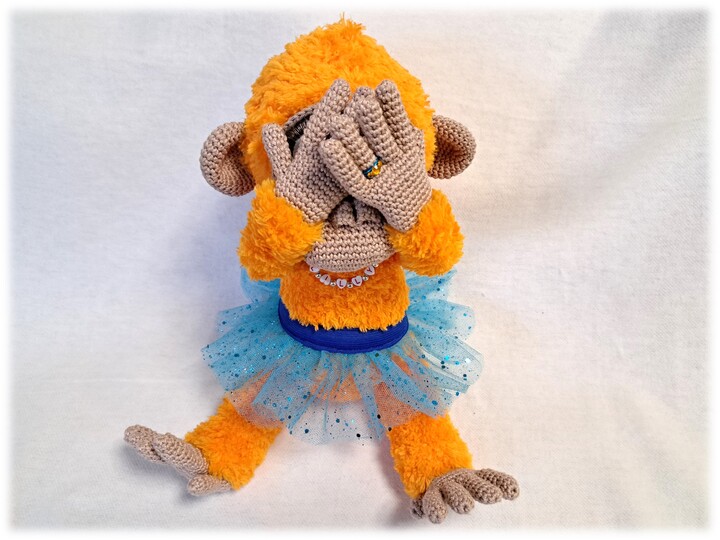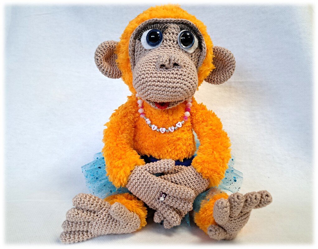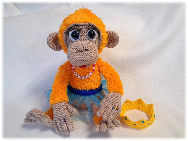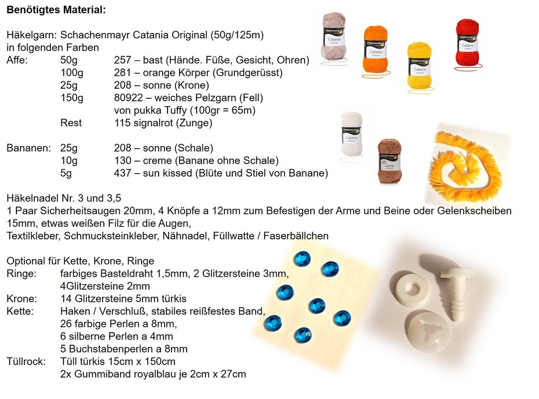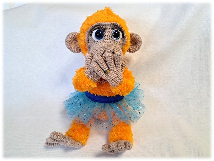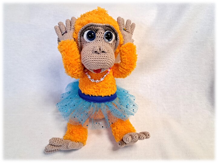 This article is an illustrated, detailed PDF guide for the orangutan Lilly with crown, tulle skirt, bananas, necklace and rings with 24 pages and numerous pictures.