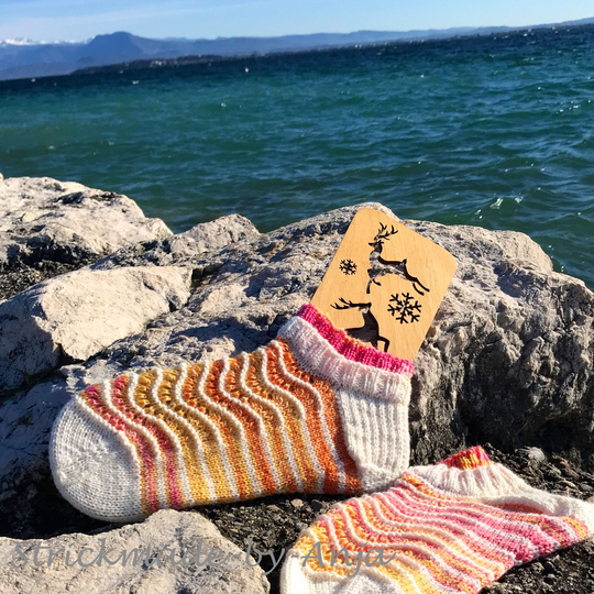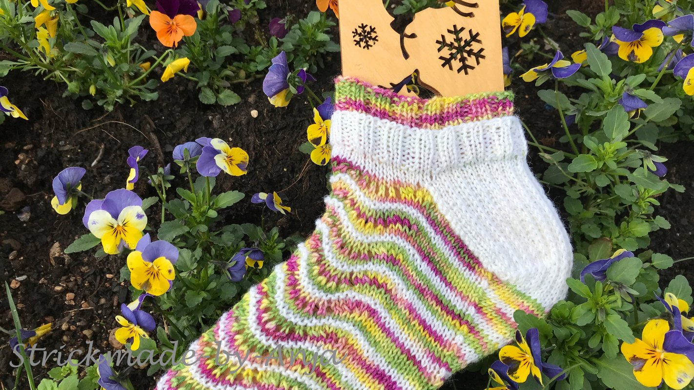 You will need 4-ply sock yarn with a running length of 400/420m per 100g in 2 different colours of your choice. You will need approx. 30g per colour for size 38/39.