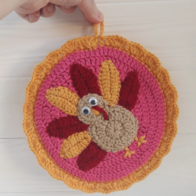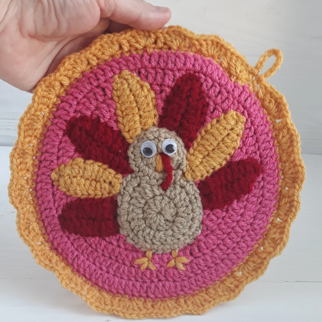 The round potholder pattern is written in English