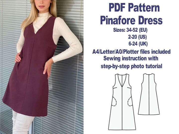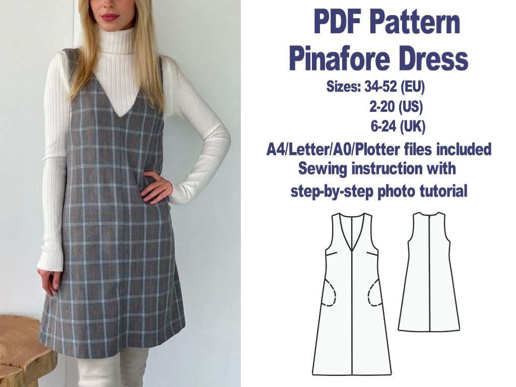1) Pinafore dress with bust darts, v-neckline, in-seam pockets, invisible back zipper, finished back length from waist– 49 cm,
